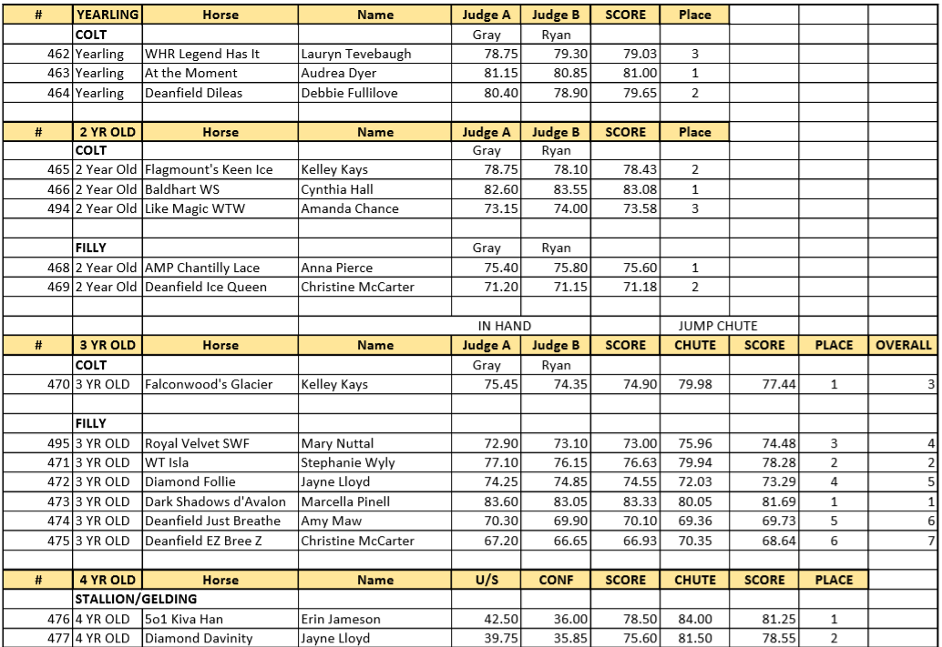 Debbie Fulllove’s Deanfield Dileas (Braveheart x Jaddabreathe) an Irish Sport Horse colt scored a 79.65 to finish second in the Yearling Championship and Lauryn Tevebaugh’s WHR Legend Has It (Legacy Obsidian x Caret) was close behind with a score of 79.03 to finish third. The colts took over the Yearling Championship as there were no fillies entered.