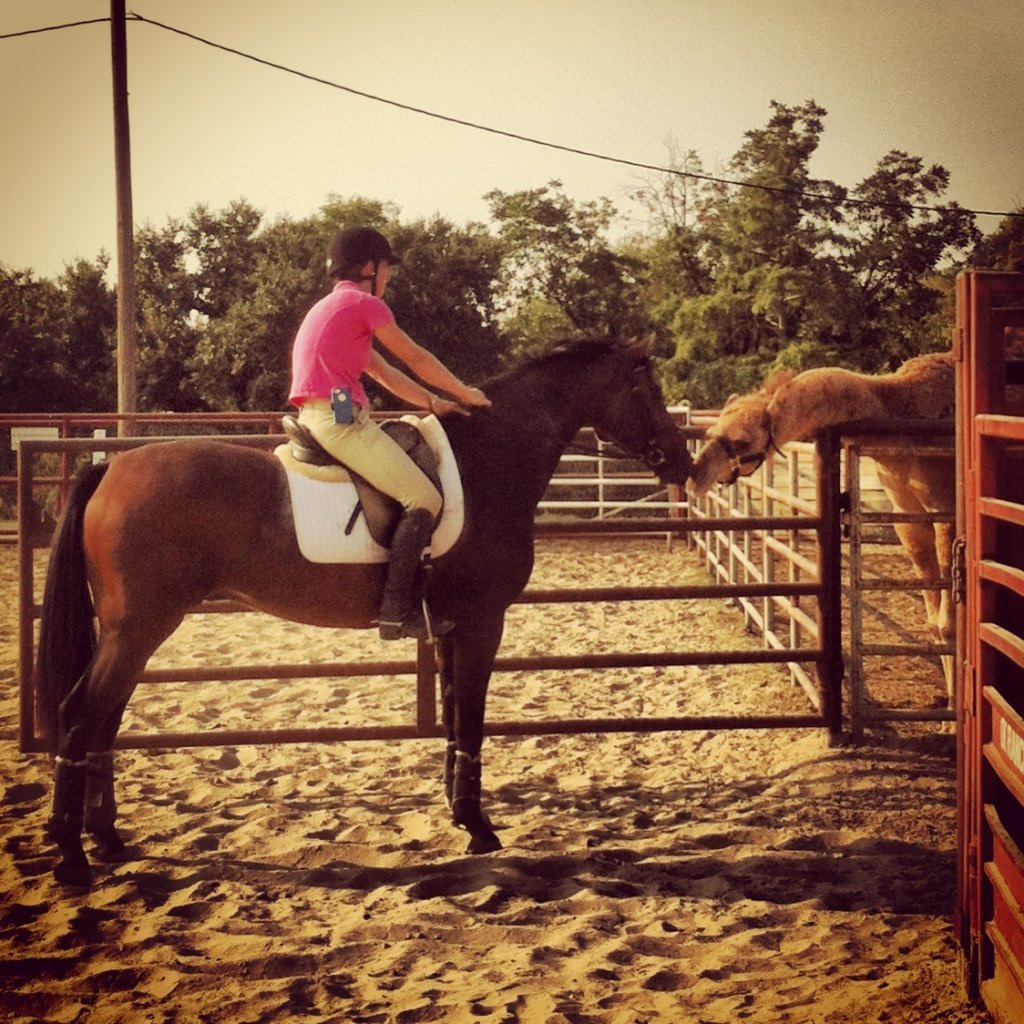 Photo 2 - Elisa Wallace and "Corteo" go for a hack on the trails at the Ft. Worth Stockyards. Corteo, aka "Tate" is laying over at the Stockyards for the week before heading to the AEC's while Elisa competes at the Mustang Million. PS - The Camel still loves him!