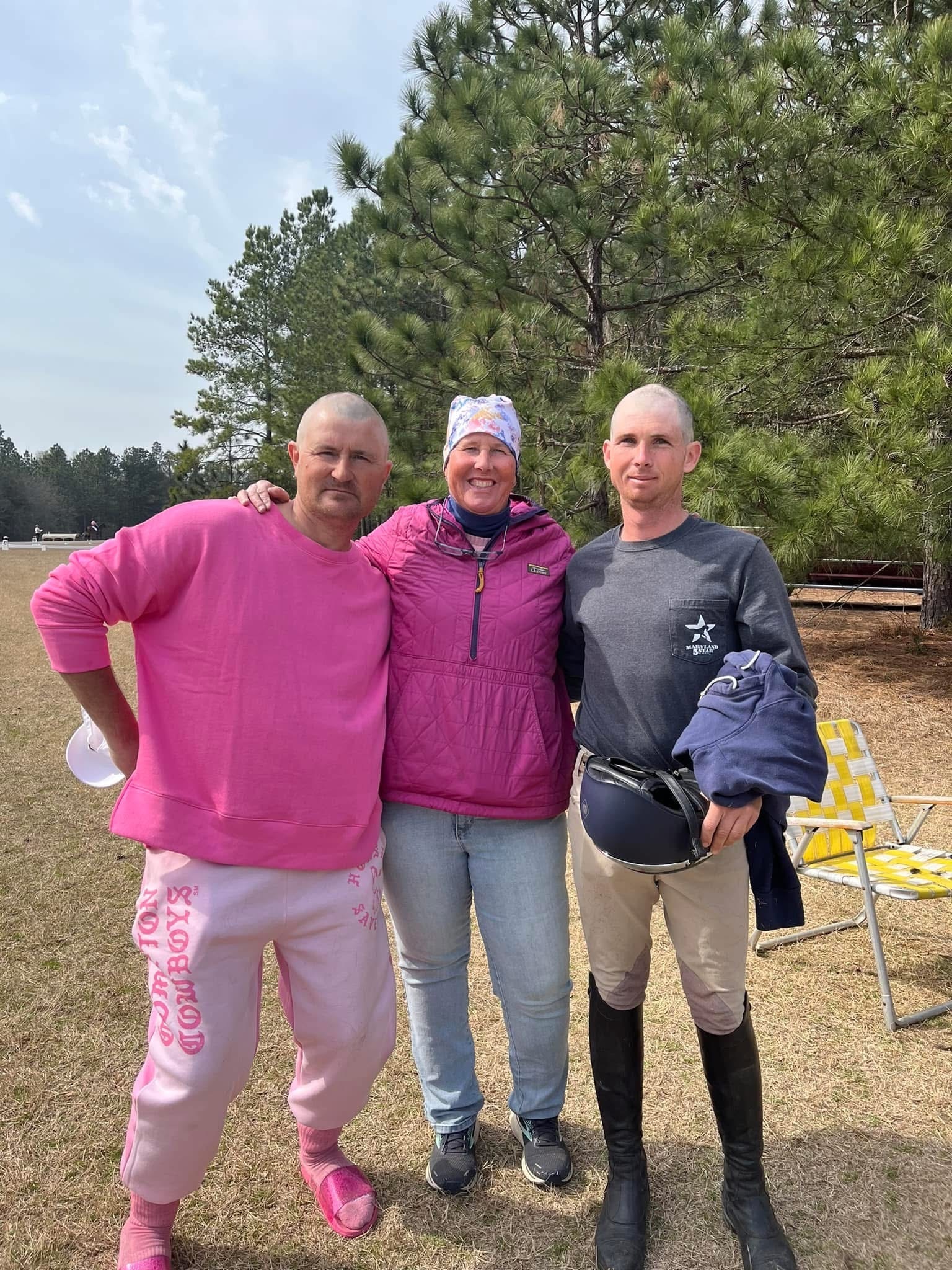 For Alison, one of the most difficult aspects of treatment was hair loss, and it began much earlier than expected—around the fifth week of chemo. So, she made an appointment with her stylist to shave it off. The following day, while attending a jumper show at Bruce’s Field in Aiken, show jumper Ronan Moloney and eventer Mike Pendleton were asked if they would also shave their heads in solidarity. Grenier, who manages Alison’s website and social media, turned the challenge into a full-blown fundraiser for Locks of Love, a non-profit that provides custom-made hair prosthetics to children. Ronan took it a step further—offering donors the chance to pull a wax strip from his head for $25 after shaving. “Two days later, most of the competitors at the farm’s weekly combined test decked out in pink outfits for the Bald is Beautiful Beauty Pageant and helped raise over $4000 for Locks of Love,” said Grenier.