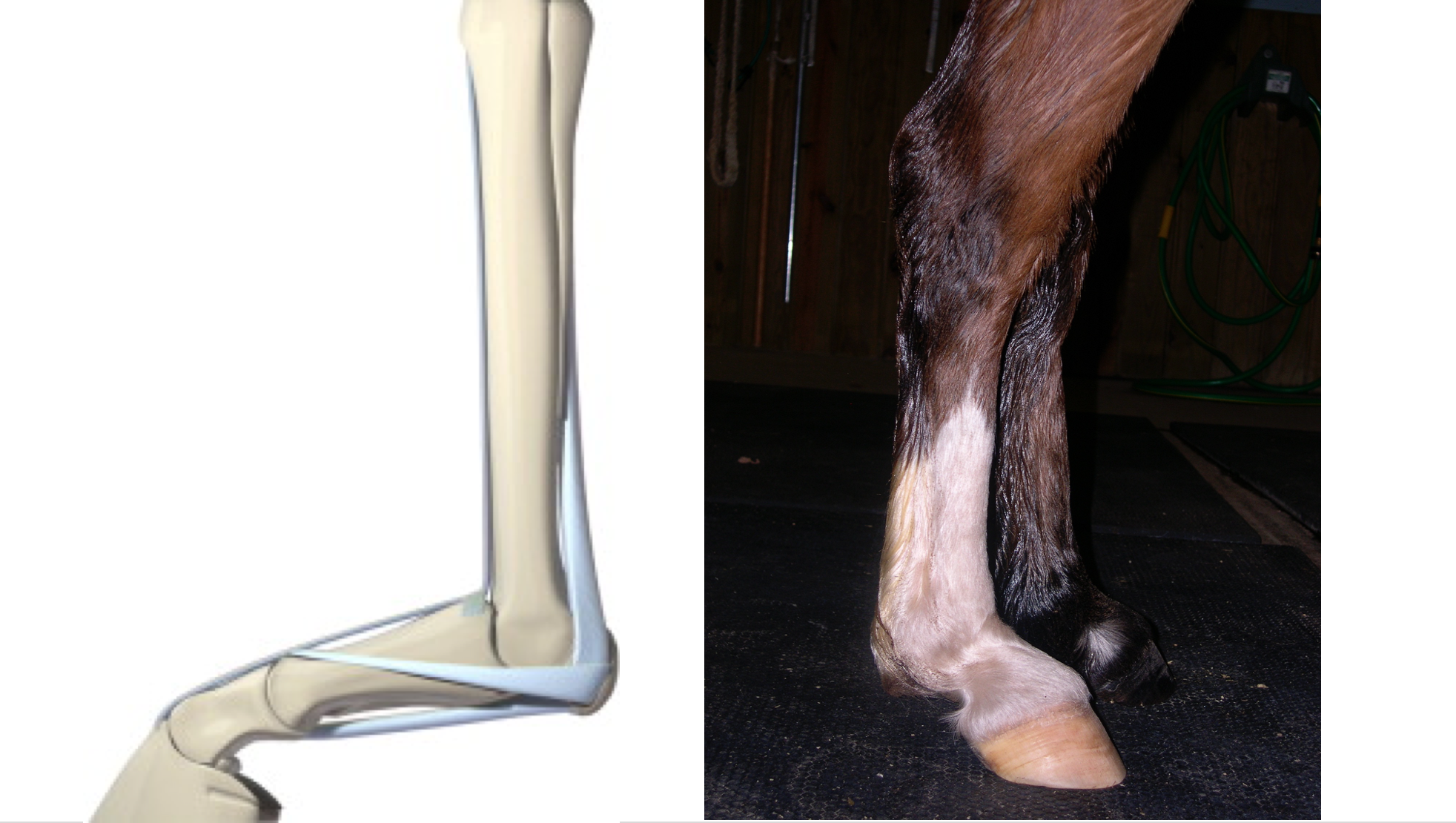 “One of the most important things that I look at are the hind fetlocks. When the hind fetlock starts to get a little saggy or starts to drop, when they’re walking you can see that they really sink,” Adams continued. “Instead of having this nice upright conformation, they start sinking. This is often combined with a straight hock, which places severe stresses on the suspensory ligament at all times, making them exceedingly prone to injury of this structure.”