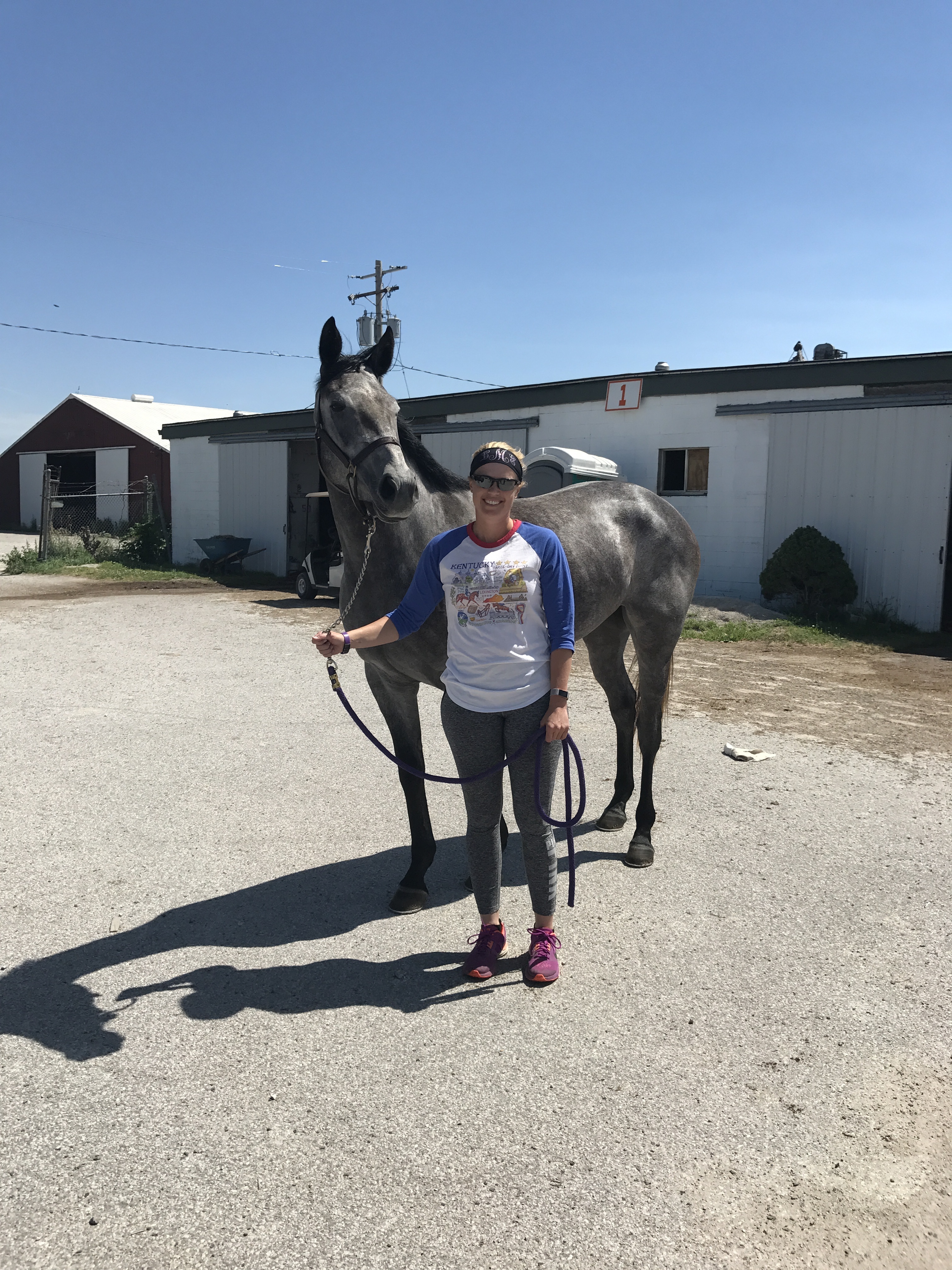 My name is Lacey Messick, I event out of Area IV, and am an adult amateur living the dream in Springfield, Missouri. I was randomly scrolling through Facebook in early June of 2017 and came across a CANTER Illinois posting of a gorgeous (too slow) 2014 gray off-the-track Thoroughbred (OTTB) mare named Classy Empress. I was immediately smitten. Did I mention I’m a mare girl? Love them! I mean sure, it takes a second to get them to believe in your cause, but I am a firm believer that once you get a good mare on your side she will gallop through fire with her ears pinned just begging someone to question her cause and she will happily take you with her!