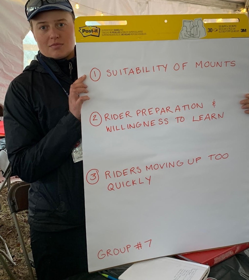 As you might imagine, the discussion was lively and productive. Different issues and challenges were identified for different skill levels of riders, age groups, competition levels, varied horse ages/experiences, and support systems. Each group was asked to summarize their discussion in writing on their flip chart.