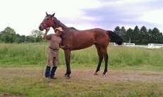Jim Gibson poses with OTTB “Old City Bar”, in June 2011, after pulling his racing shoes. OCB is now at his new home in Kansas. Photo courtesy of Susann Jones.