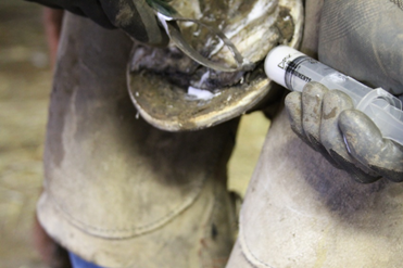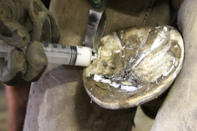 Due to the thinness of the sole and the extensive debridement that was required, Jim is administering paste antibiotics. Photo courtesy of Susann Jones.Jim would like to remind potential owners that they must work with and support the conformation the horse has, not what ‘looks good’. The orthopedic structure of equine feet is set by bone structure and genetics; it cannot be changed but the soft tissues of the foot can be changed with trimming and patience. The hoof capsule is a dynamic structure. It moves and readjusts to the locomotion of the horse and the environment in which the horse lives. Correct trimming will set the internal structures up correctly and then the hoof capsule can ensure the hoof grows correctly to meet the movement and soundness of the horse.