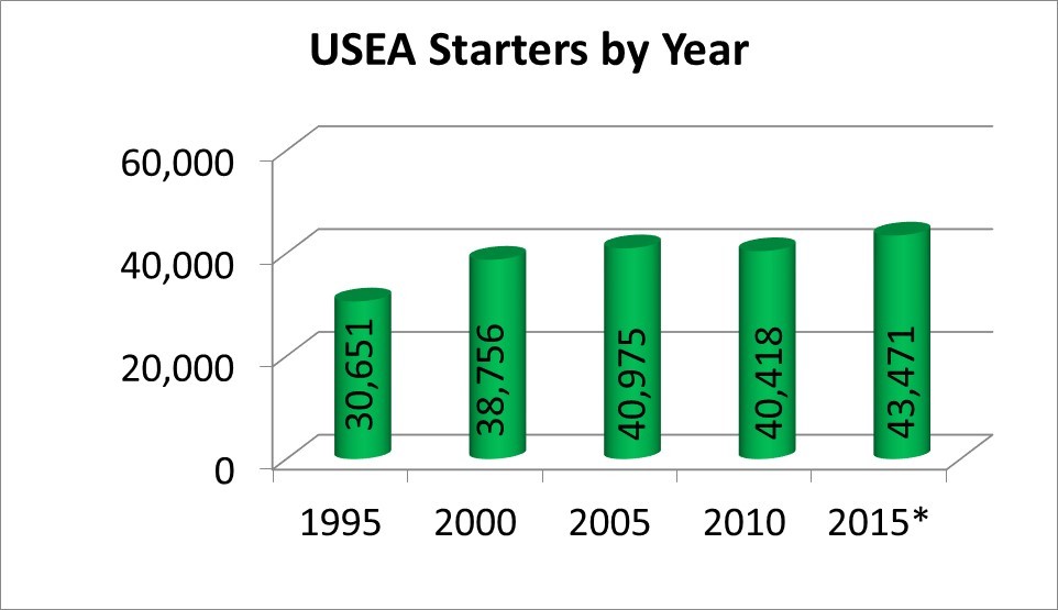 For the third straight year the number of starters at USEA recognized competitions increased. There have been 43,471 starters as of November 24, 2015 with one (*) competition still scheduled to occur on the final weekend of the year. This competition year will rank as the third highest in terms of starters in the history of the USEA. The previous high points were reached in 2006 (44,324) and 2007 (45,667) just before the economic recession.