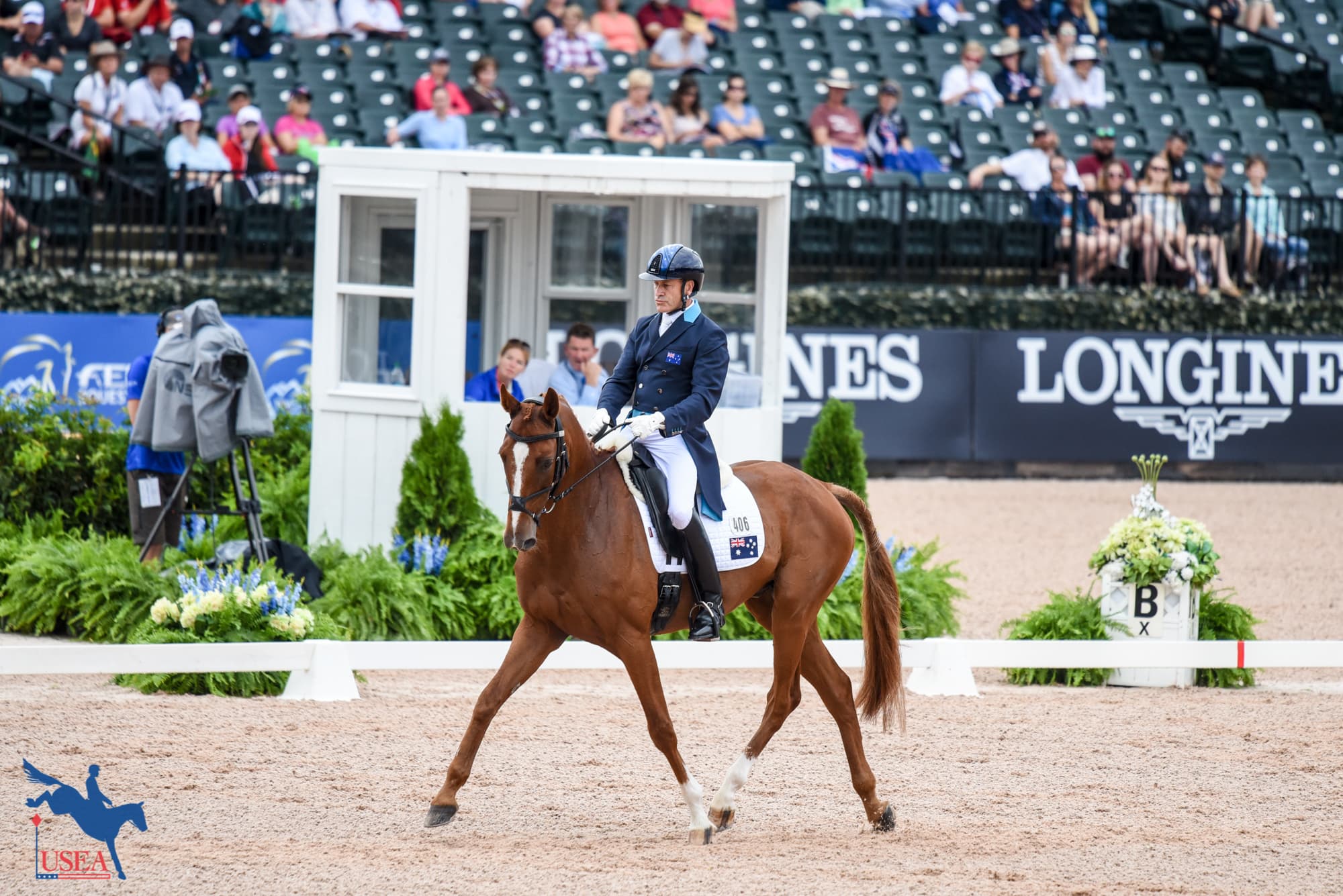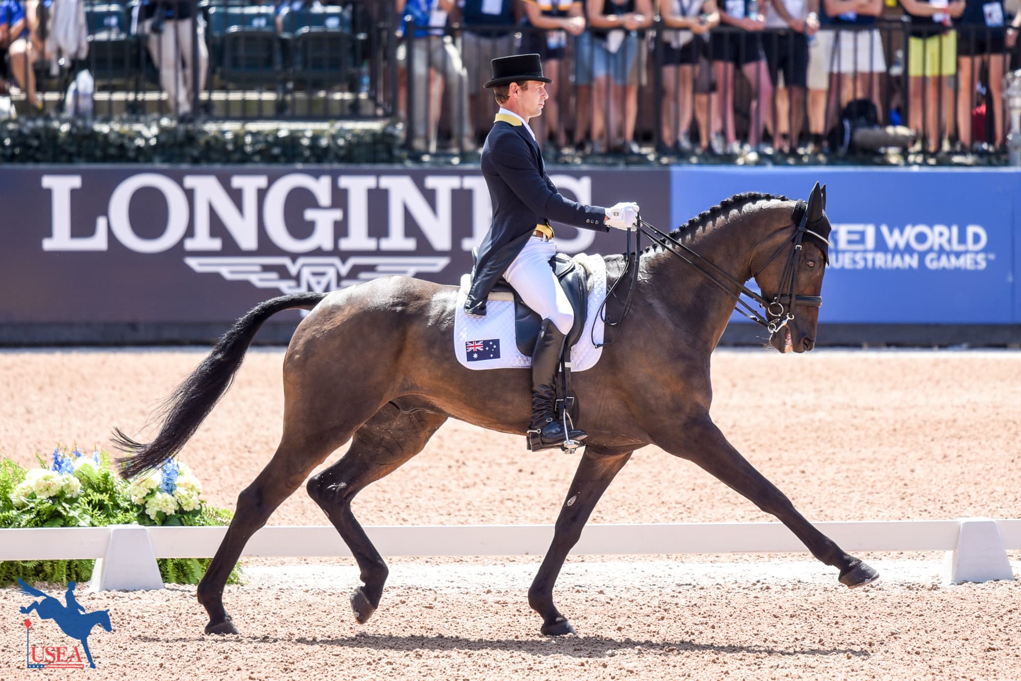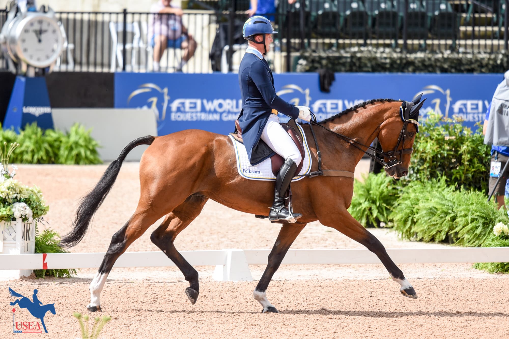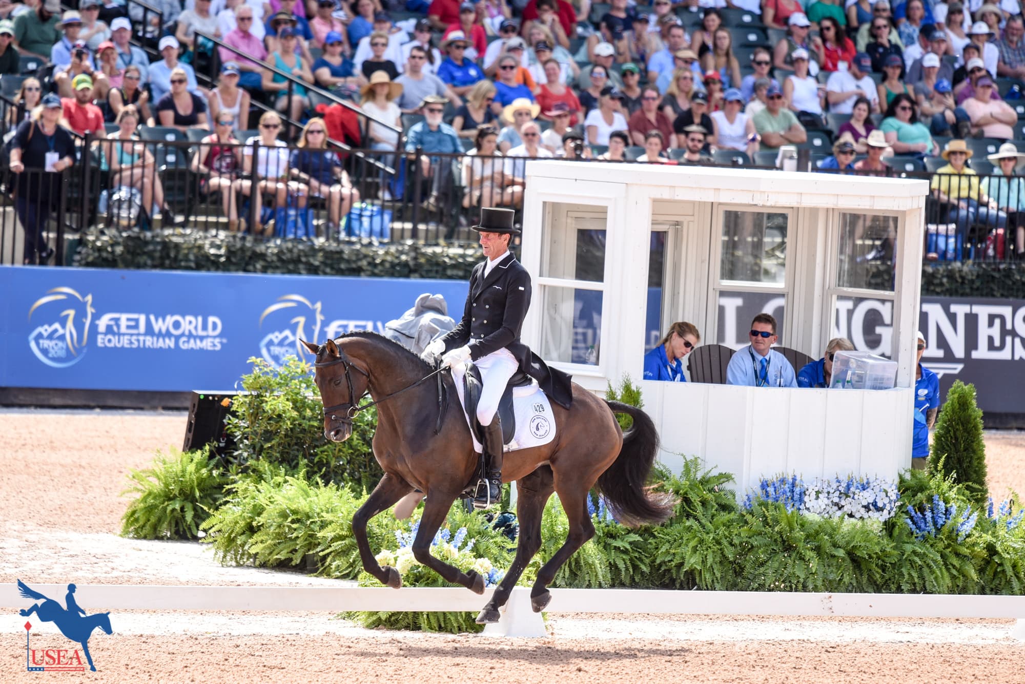 Hurricane Florence seemed like just a nasty rumor today at the Tryon International Equestrian Center in Mill Spring, North Carolina as the first day of competition in the FEI World Equestrian Games Tryon 2018 (WEG) eventing world championship got underway. Dressage judges Anne-Mette Binder (DEN), Andrew Bennie (NZL), and Jane Hamlin (USA) saw the first 42 horses in the 83-horse field canter down centerline over the course of the day. The afternoon’s competitors produced some impressive tests with seven combinations dancing their way into the top 10 after the lunch break.