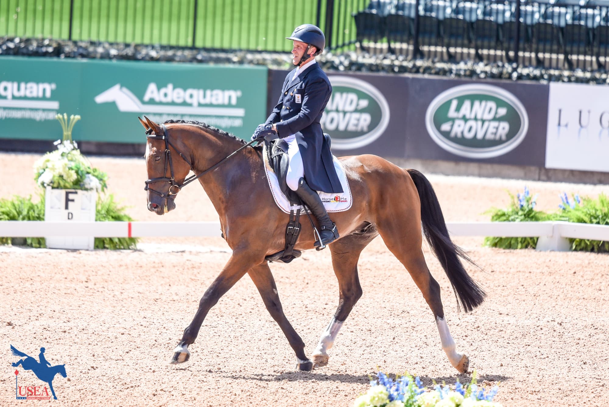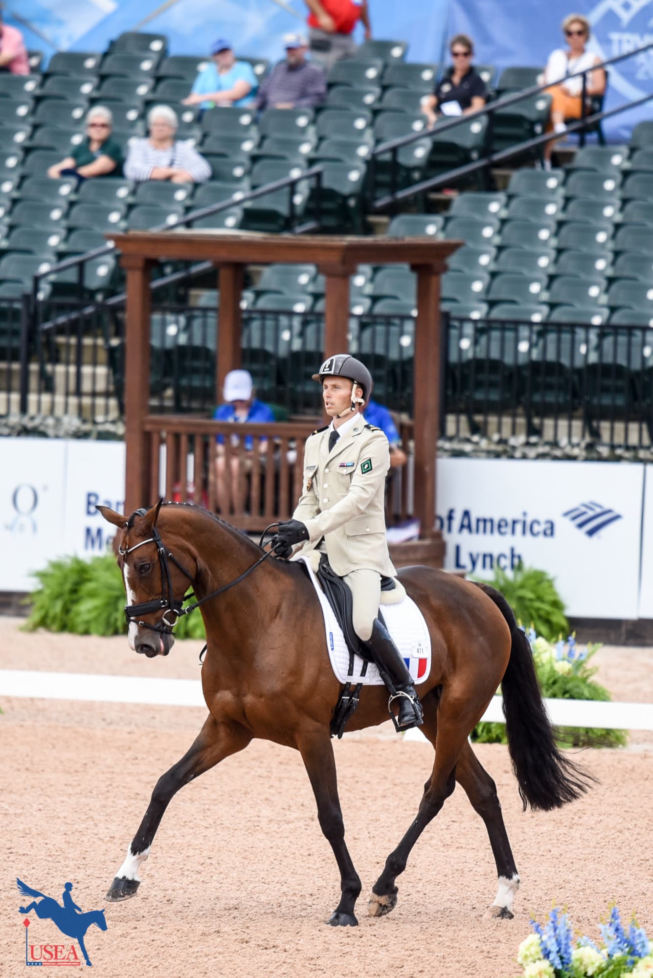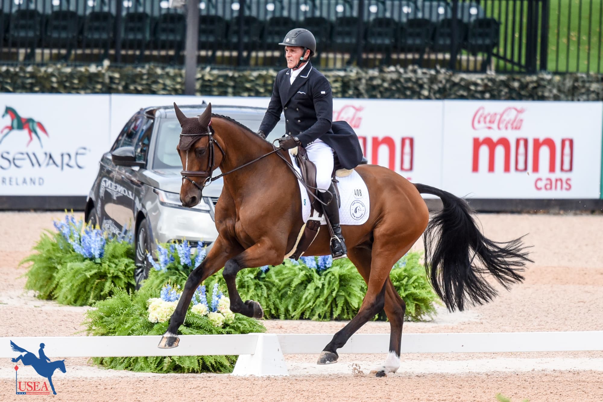 William Coleman and Tight Lines (Turgeon x Merindole), The Conair Syndicate’s 11-year-old Pur Sang gelding, were first out for the Americans this morning, scoring a personal best for this dressage test with a 35.6. Coleman and Tight Lines completed the test twice at the Kentucky Three-Day Event, scoring a 54.4 (converted to 36.3) in 2017 and a 38.3 in 2018.