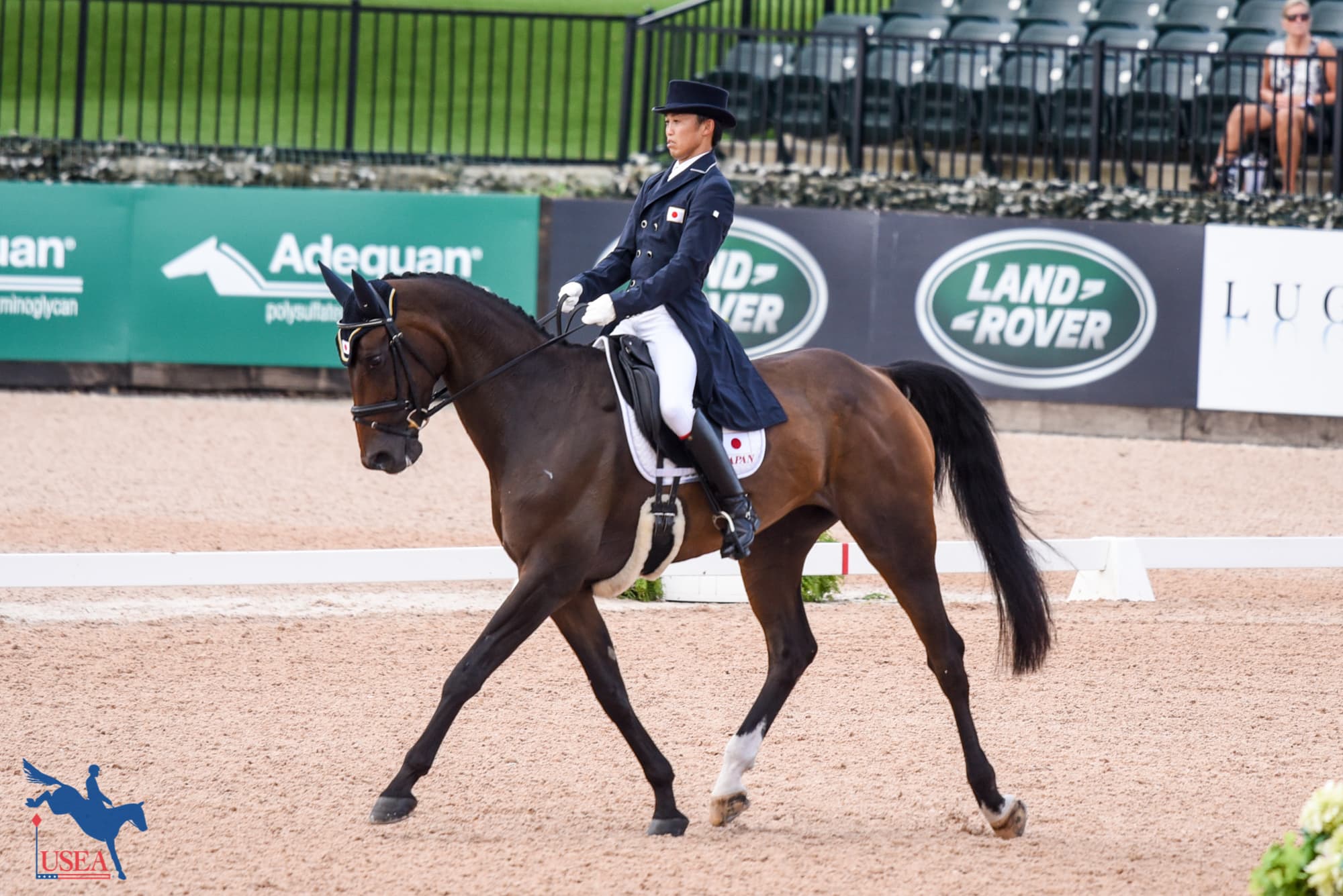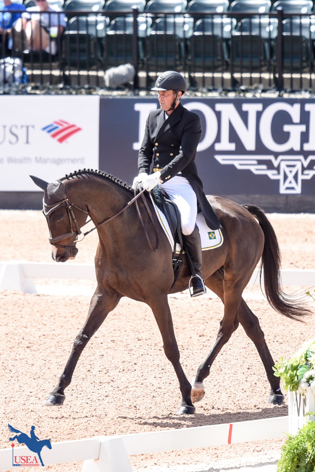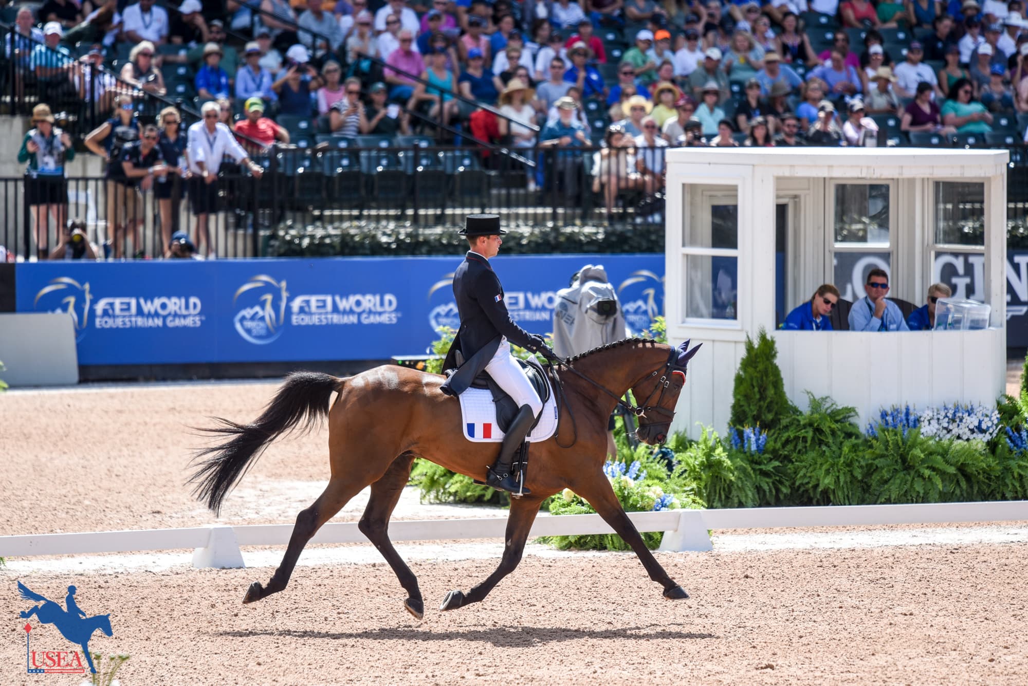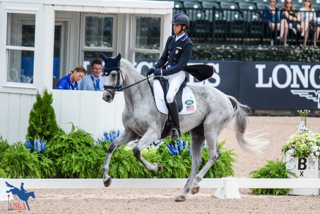 William Coleman and Tight Lines (Turgeon x Merindole), The Conair Syndicate’s 11-year-old Pur Sang gelding, were first out for the Americans this morning, scoring a personal best for this dressage test with a 35.6. Coleman and Tight Lines completed the test twice at the Kentucky Three-Day Event, scoring a 54.4 (converted to 36.3) in 2017 and a 38.3 in 2018.
