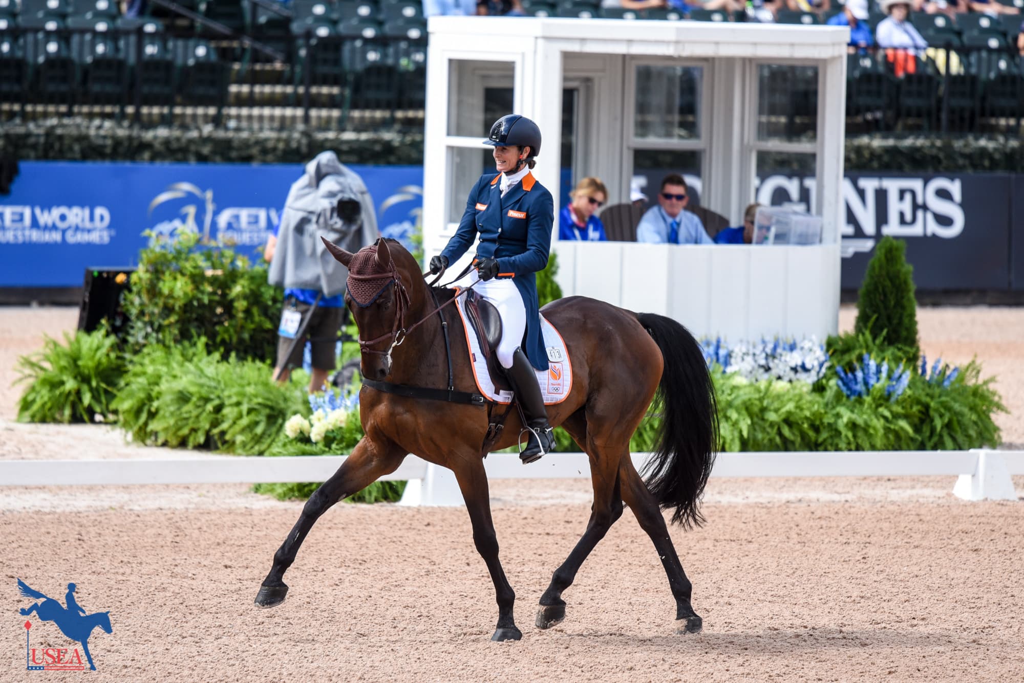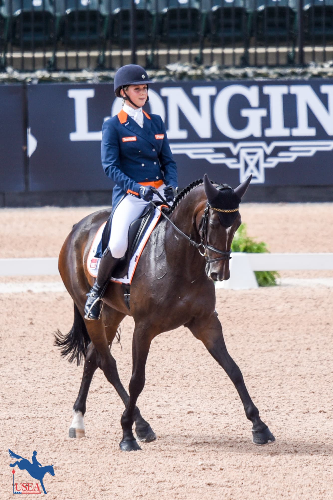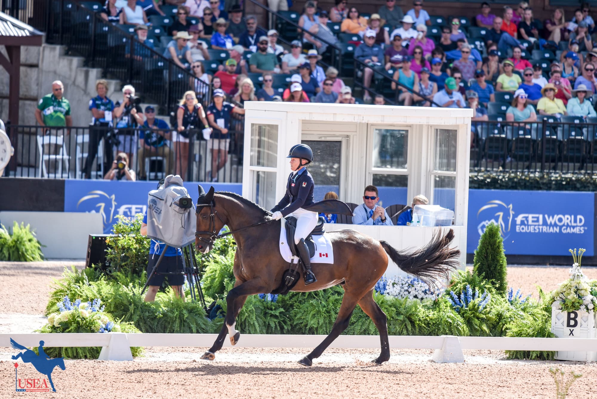 Lauren Kieffer and Vermiculus (Sazeram x Wake Me Gently) were the third and final U.S. pair to dance in the sandbox today. Kieffer and “Bug,” Jacqueline Mars’ 11-year-old Anglo Arabian gelding, are competing as individuals for the United States and scored a 32.6 for 20th place. Vermiculus has also performed this test three times now, scoring a 43.8 (converted to 29.2) in 2017 and 31.2 in 2018.