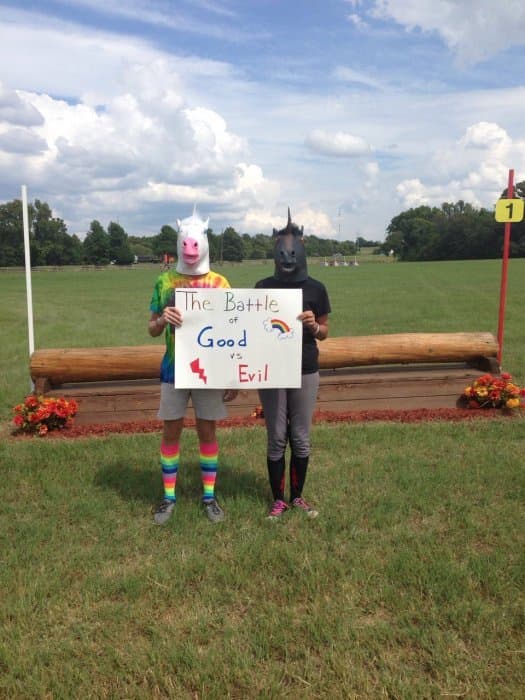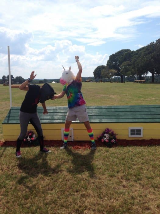 Bobby Covington and I are barn-mates and have been showing together all year. We are also great friends and act kind of ridiculous when we're together. We competed Beginner Novice together all spring. Right before the Horse Trial at Texas Rose in June I decided, very much on a whim, to change my entry to Novice instead. Even though it had been raining for the entire month of May... and even though we'd hardly been able to ride for weeks... and even though the course at Texas Rose isn't really known for being an easy move up. Bobby thought I was crazy, but he said "If anyone is special enough to pull that off, it's probably you," and sent me several memes about being special, one of which featured a unicorn. I sent him a unicorn one back, and that sparked several days’ worth of unicorn themed photos going back and forth. On the day we left for Texas Rose he gave me a present which was a unicorn gift bag with a unicorn t-shirt inside. He was wearing a unicorn t-shirt himself, so we spent all weekend “unicorning” it up as I took on the Novice division.