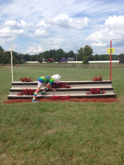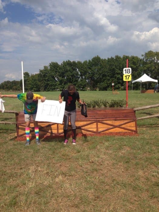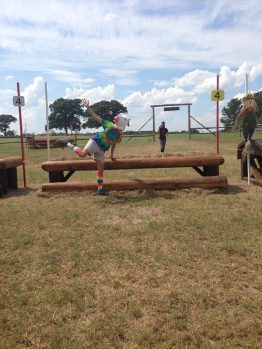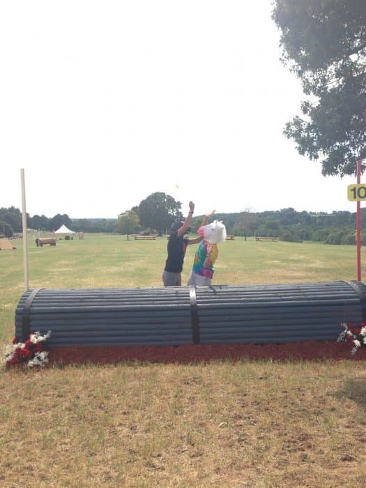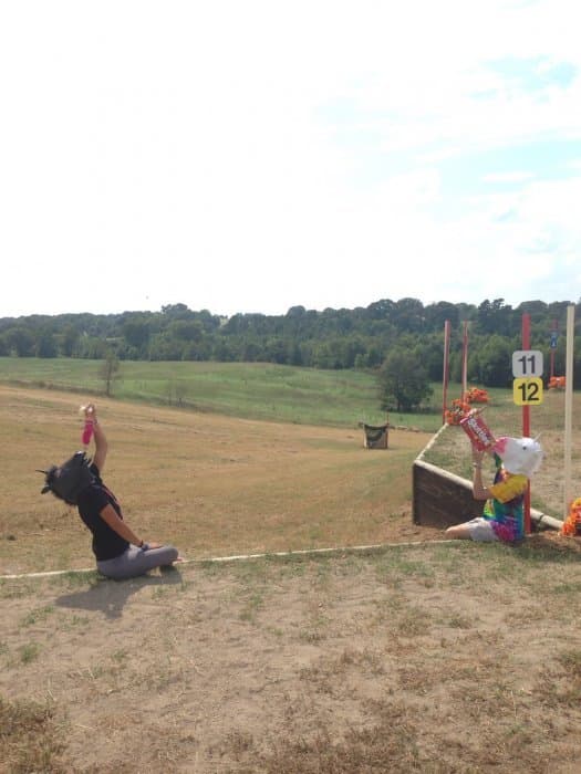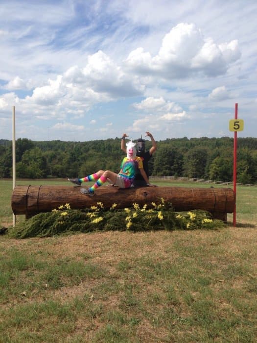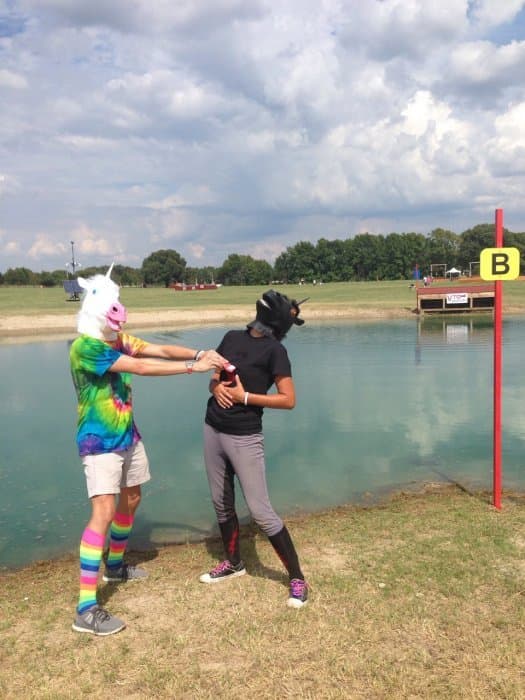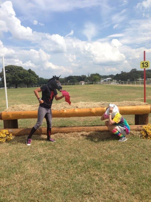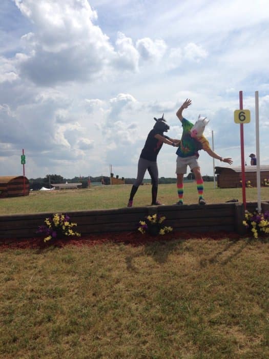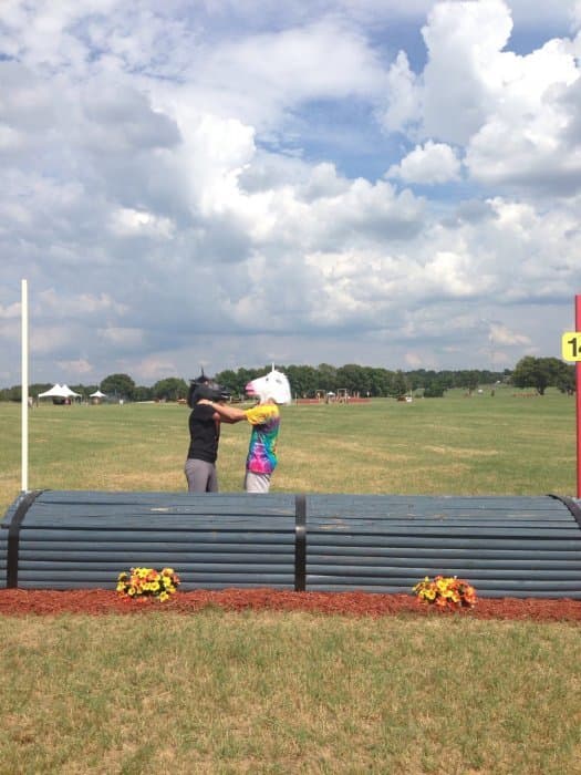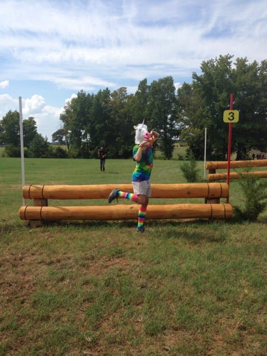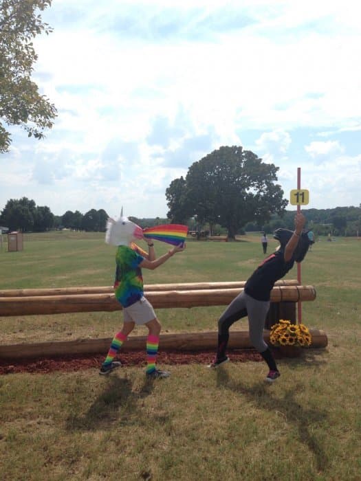 The course walk was my baby. Bobby and I do goofy course walks at every event we go to, but I wanted the AEC one to be particularly good. I got the unicorn masks and outfits together, came up with a storyline idea, and drafted Bobby and Jeannette into playing the roles of the unicorns. Pictured left. We were out there in the afternoon sweating our buns off and looking like total fools (oh the looks people give you when you walk around cross-country with a unicorn mask on), but we had a good time shooting the pictures for the walk. We also threw a party on Thursday night by the tent barns, open to any and all, where we had unicorn races and played Pin the Horn on the Unicorn, giving out Riding Warehouse gift cards and other unicorn stuff as prizes.