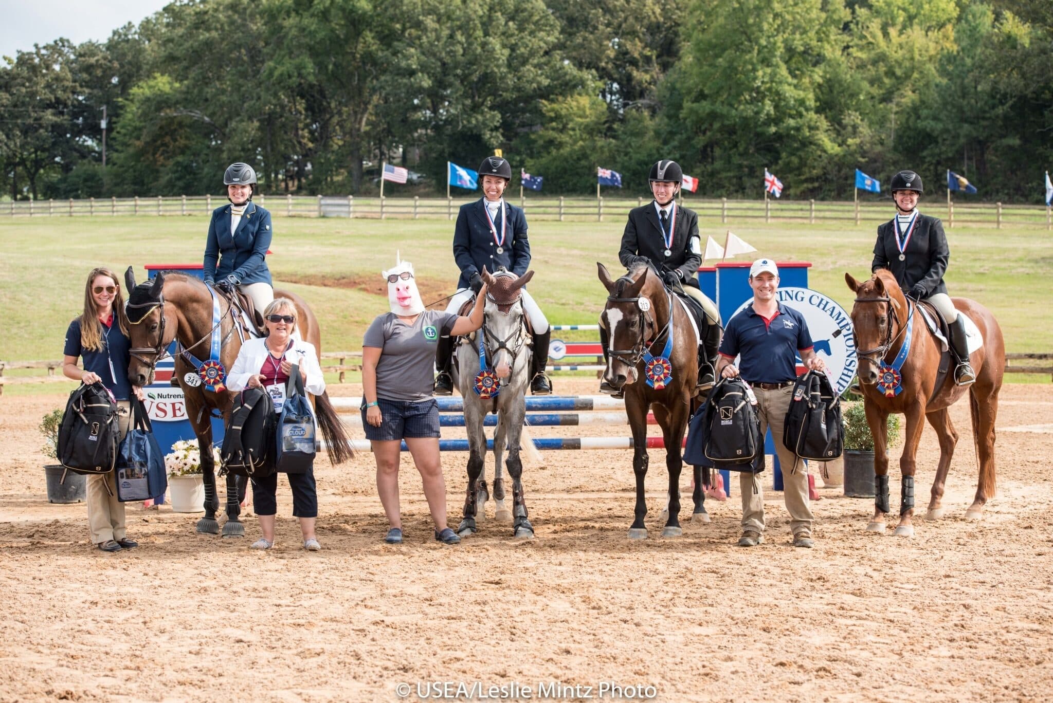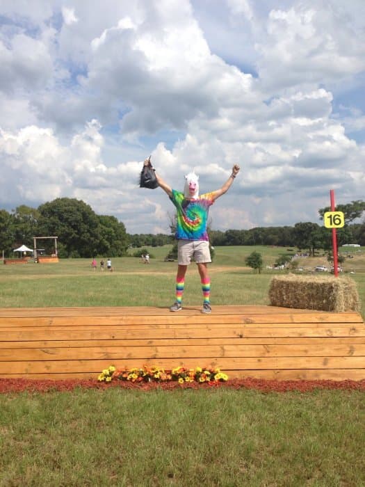 The night before dressage day our trainer, Amanda Merritt, foolishly made us a bet that if we won ATC she would wear the unicorn mask in the awards photos. We took that bet very seriously, so when we won I made her come out in the ring and put the mask on. Everyone got a good laugh out of it. Competing is such serious business, especially at the AEC. It was nice to have those moments of levity that our unicorn-related ridiculousness provided.