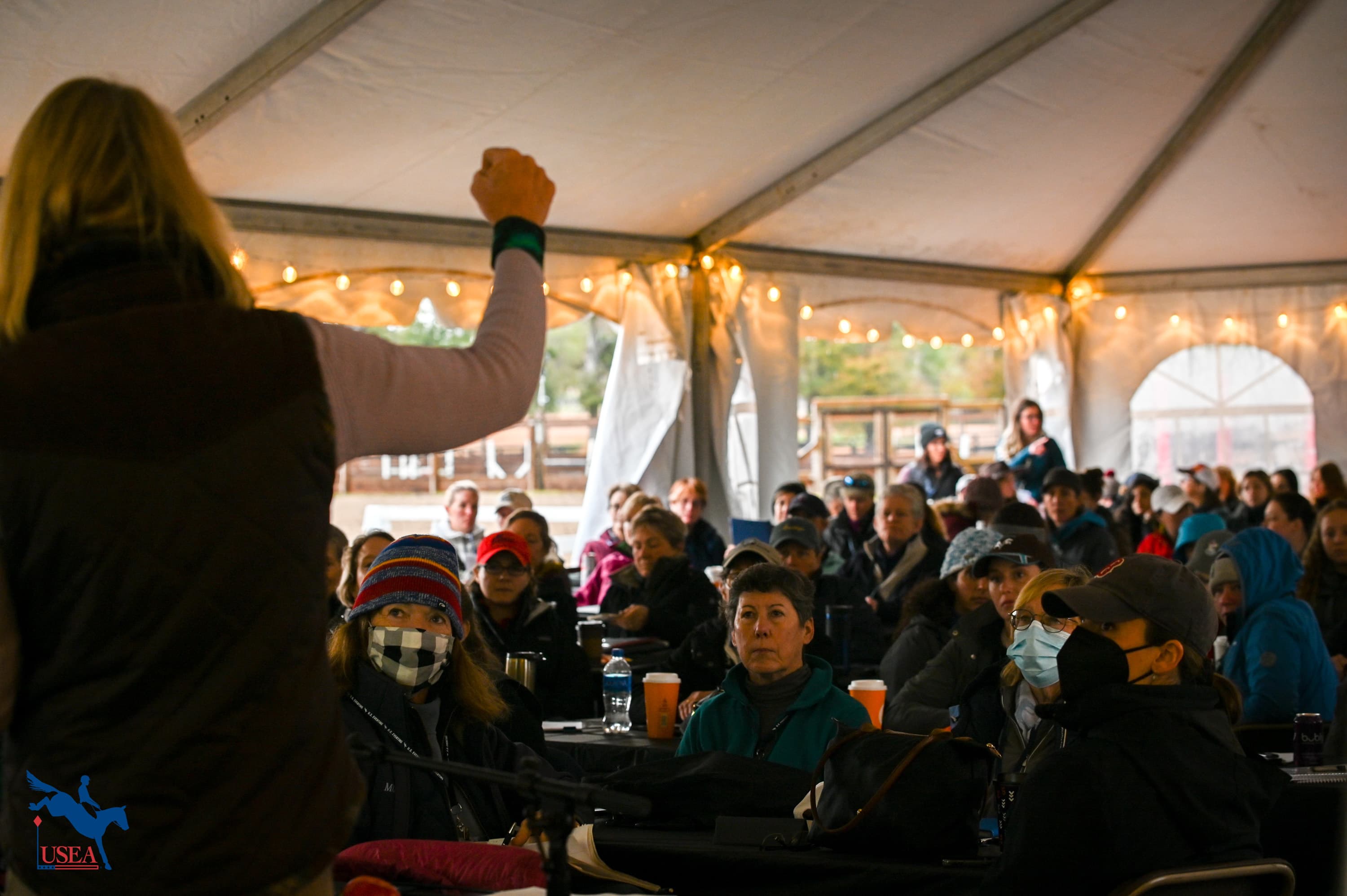 Despite the light drizzle, trainers and auditors filed into the tent at Barnstaple South leaving no seat empty for the first day of the 2022 ICP Symposium at Barnstaple South in Ocala, Florida. There were 140 USEA members in attendance, half of which were currently USEA Instructors’ Certification Program (ICP) certified instructors and the other half who were eager to learn more about the program and obtain critical skills from the symposium to take home to their students or to apply to their own riding.
