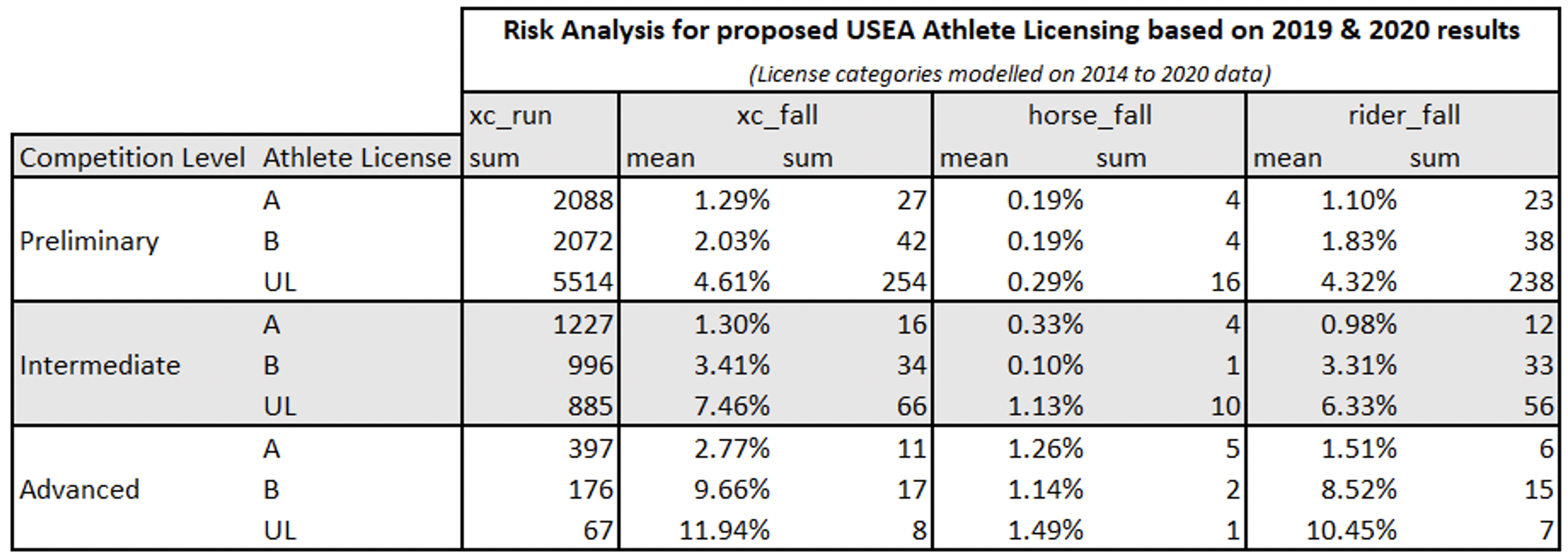 Dave Vos, member of the USEA Cross-Country Safety Subcommittee, an amateur eventer, and a highly experienced engineer, joined the call to explain the numbers and data collected by EquiRatings to the Board. “The statistics tell you what the picture is, and they tell us that we need to reduce the fall rate and therefore reduce the risk of serious falls happening,” said Vos. “While addressing risk is the main driver, we are also addressing the quality of riding throughout eventing in the United States and that goes very much hand in hand with additional experience, additional expertise, and additional training in order to move up the ranks. You build a much better foundation if you are way more proficient at Training before you go to Preliminary and so on. Where we are is that the numbers aren’t crazy different from what people are already doing, but they do encourage additional experience and training.”