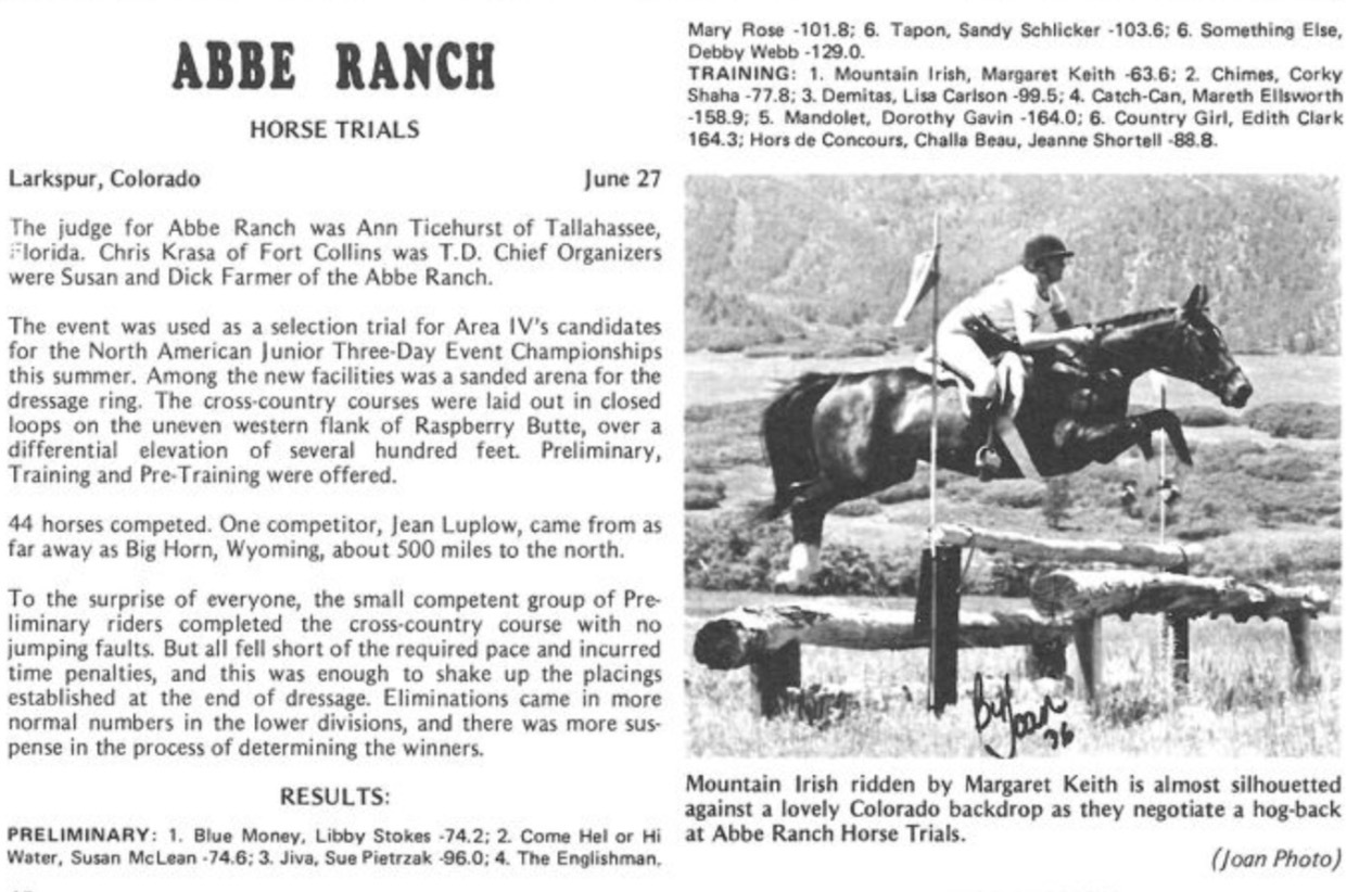 Susan immediately began hosting Pony Club rides and regional rallies as well as tetrathlons, pair pace events, dressage shows, and clinics. Abbe Ranch hosted its first USEA recognized horse trials in June of 1976. Abbe Ranch was also the site of the USPC National Eventing Championship West in August of 1981 and has been host of the Area IX Championships three times, first in 1984 and most recently in 2006. Few other events in the United States has run for as long without interruption.