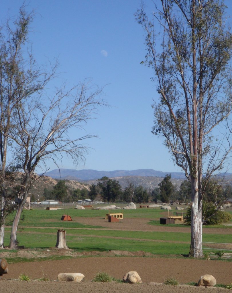 “Two signature things about our facility have to be the huge (30') eucalyptus trees planted in a row that separates the cross-country from the arenas, and the massive boulders sprinkled throughout the cross-country course. The eucalyptus were planted to create a wind barrier back when the land was used for farming. The boulders are gorgeous, and create striking views and interesting terrain - great for building cross-country jumps around!”