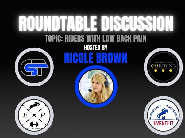 In this video, Coach Sando is joined by Dr. Jenni Douglas from Event Fit Rider Performance, Natasha Gunston from The Eventing Physiologist, and Lisa Bauman from Om Riding for a conversation moderated by Nicole Brown of the Equiratings Eventing Podcast and USEA Official Podcast for a discussion on the topic of low back pain in riders.