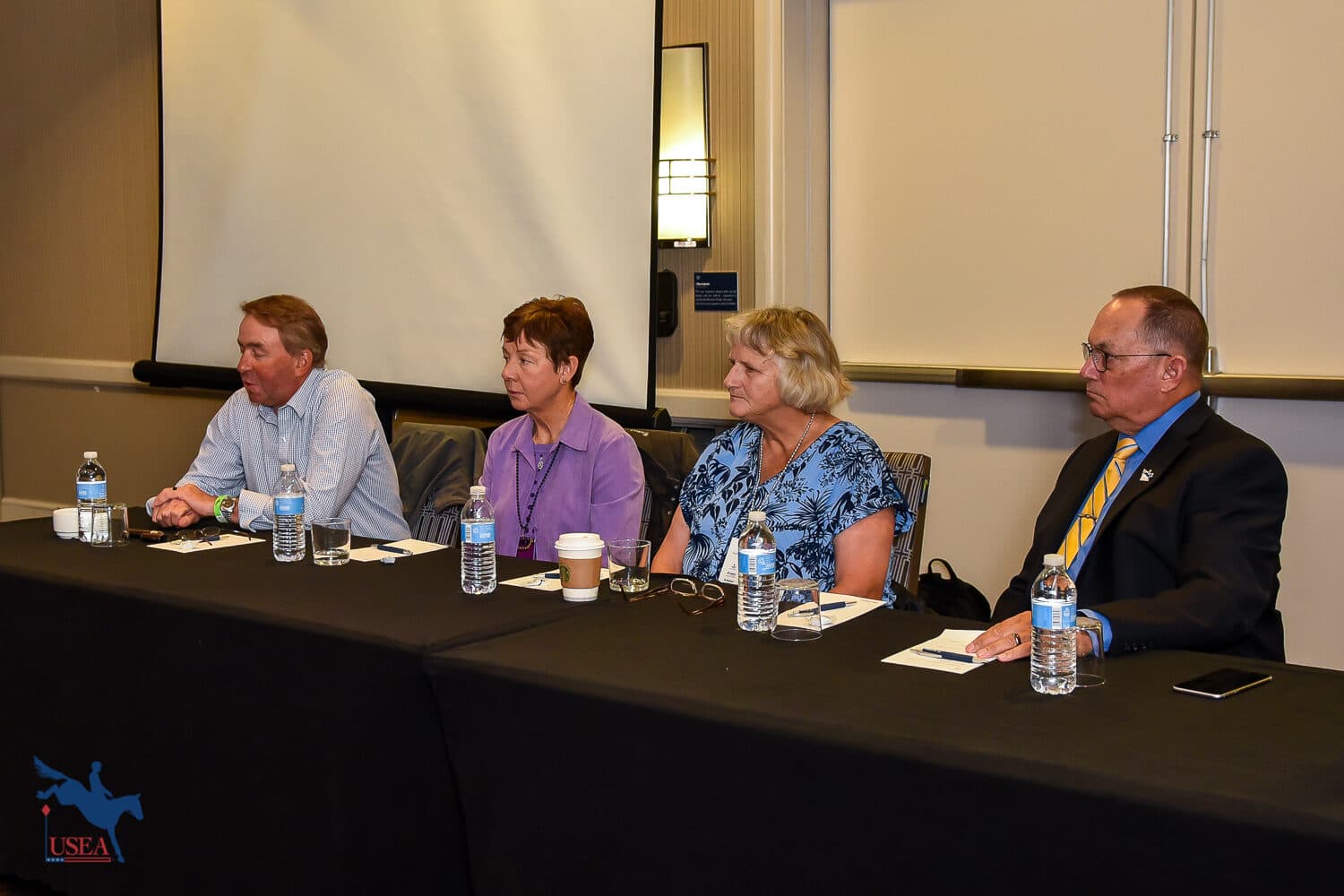 Robin Walker, Mary D'Arcy, Phyllis Dawson, and Brian Sabo led the USEA Instructors' Certification Program Open Forum at the 2018 USEA Annual Meeting & Convention. The open forum covered several topics, including the importance of remaining current with the curriculum, how Modified has closed the gap between Training and Preliminary, SafeSport, overcoaching, changes to the Eventing 18 program in 2020, and the new YEH Instructor and Professional Trainer certifications.