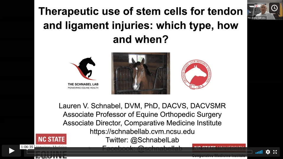 Dr. Lauren Schnabel, an Associate Professor of Equine Orthopedic Surgery at North Carolina State University's Comparative Medicine Institute, discusses the therapeutic use of stem cells for tendon and ligament injuries. This presentation is part of the Grayson Vet Chats and is provided in partnership with the Grayson-Jockey Club Research Foundation.