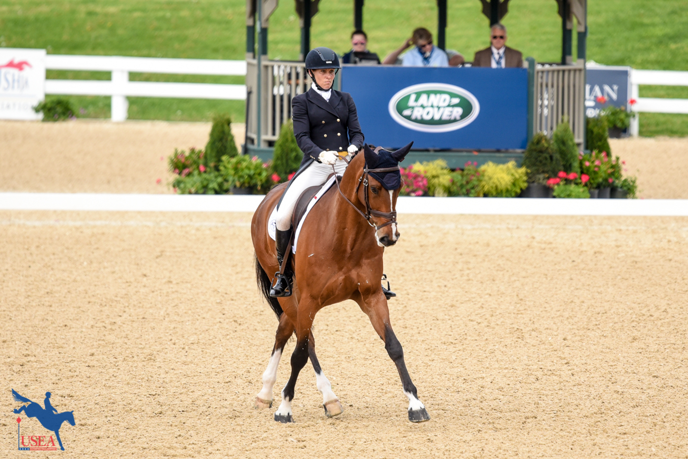 Elisabeth Halliday-Sharp sits in second place on a 30.9 aboard the Deniro Syndicate & Ocala Horse Properties’ KWPN gelding, Deniro Z. “I’m really pleased with Deniro. “He tried really really hard,” Halliday-Sharp said of Deniro Z. “The flying changes are our biggest nemesis, and those did us in the ring. But, he pushed hard, he worked hard, he tried his guts out. I thought the mark was a bit unfair because I think he did enough good things to hopefully be in the 20’s, but that’s where we are, so I’m disappointed with the mark, but pleased with the horse.”