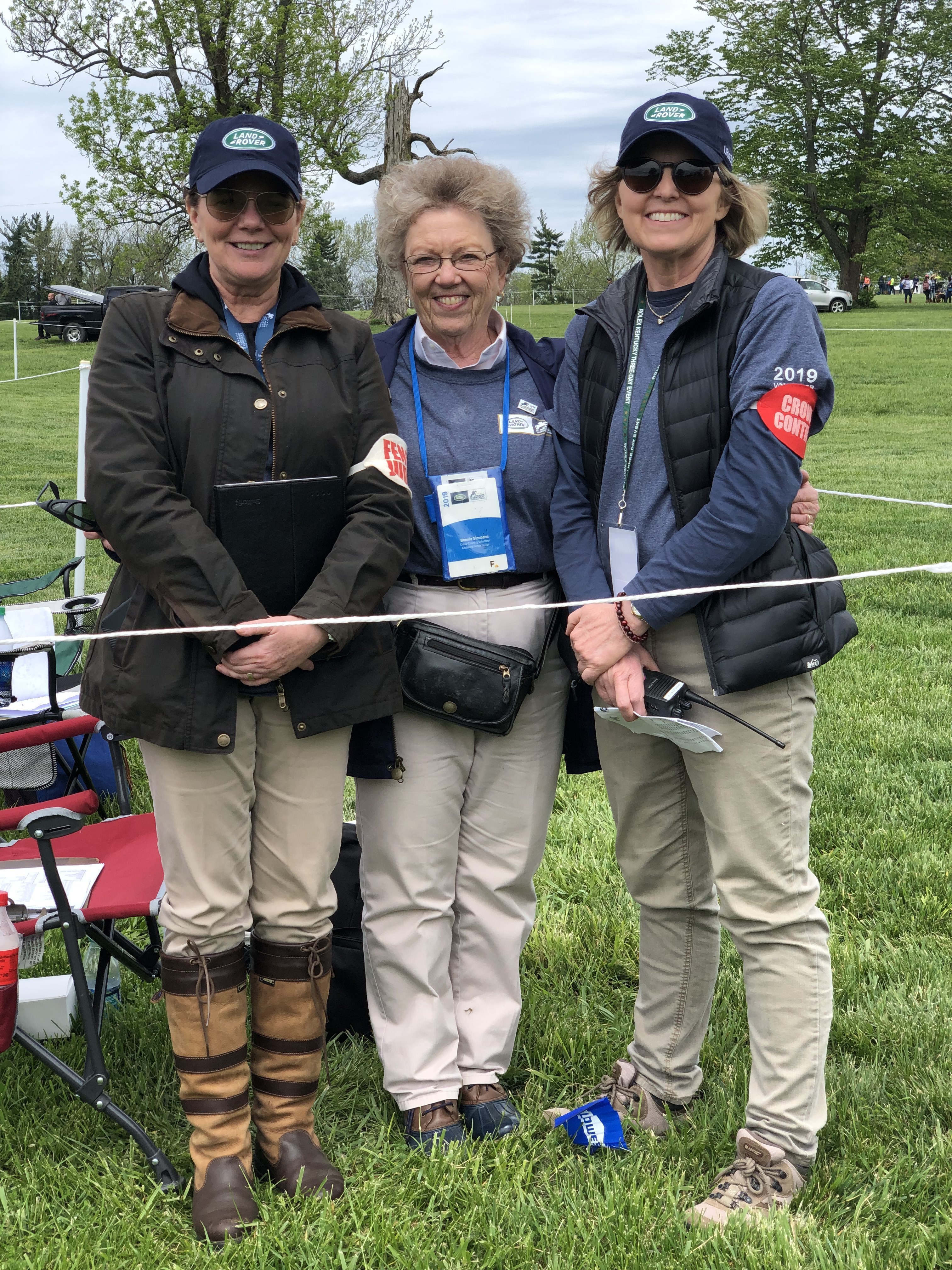 Our next stop was with mother-daughter jump judge duo Buffie Clippinger and Bonnie Simmons and crowd control member Robin Koehler. There are a group of jump judges placed at every fence with someone videoing, someone tracking the time, someone checking the footing, and someone recording what happens at the fence on paper as well. There is also a crowd control member placed with them to keep people off the ropes and keep the jump judge’s sight line clear.
