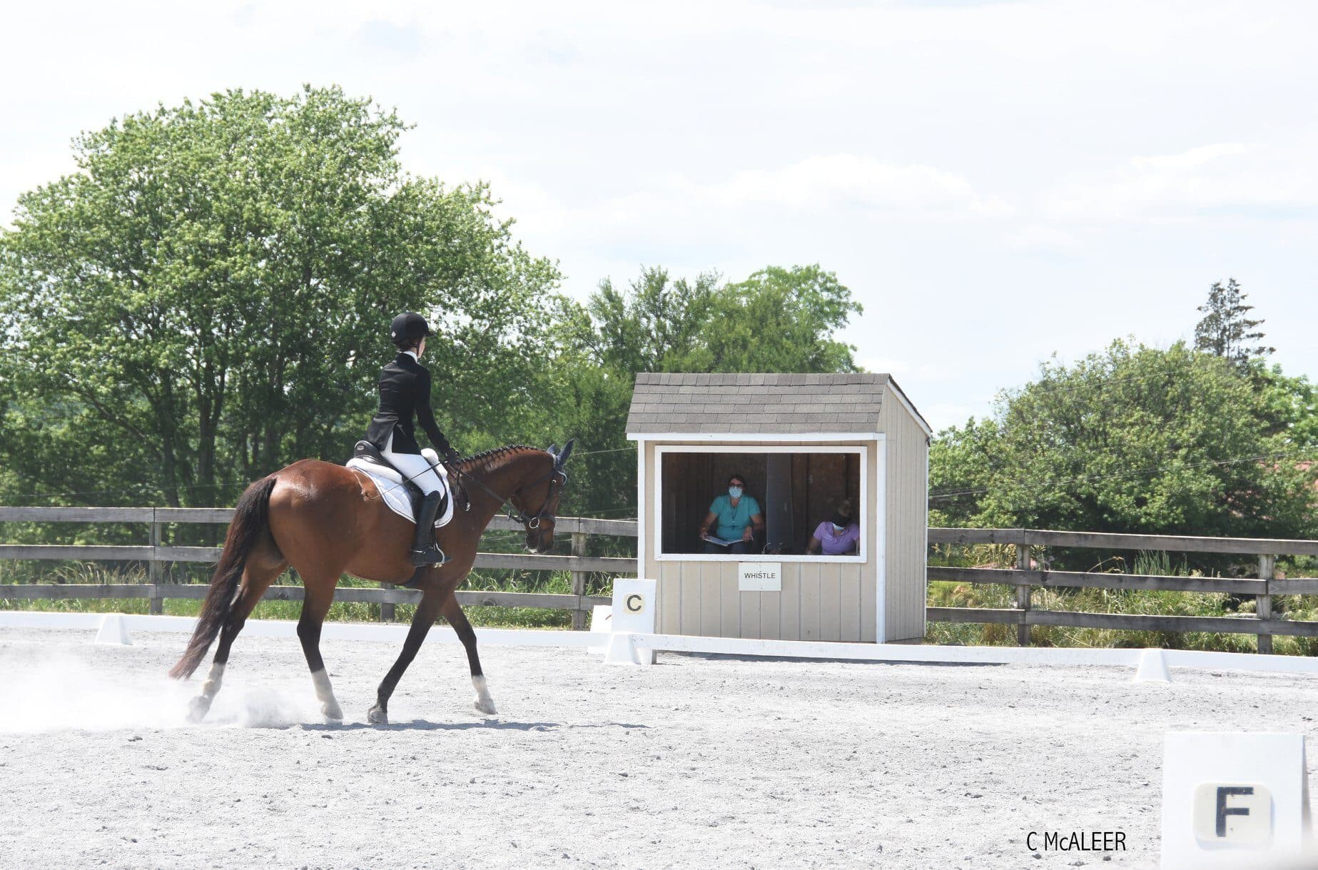 “I was a dressage scribe at Plantation Field the weekend before and somewhat knew what to expect in terms of what scribing procedures needed to be changed to avoid risks (such as physical separation of and separate tests for scribe and judge, no handing the papers back and forth or to the test runner, etc.) and I was impressed with how well these were implemented at Waredaca and how readily everyone adapted to the changes. I was also impressed with how consistently everyone on the grounds complied with the social distancing and mask rules.”