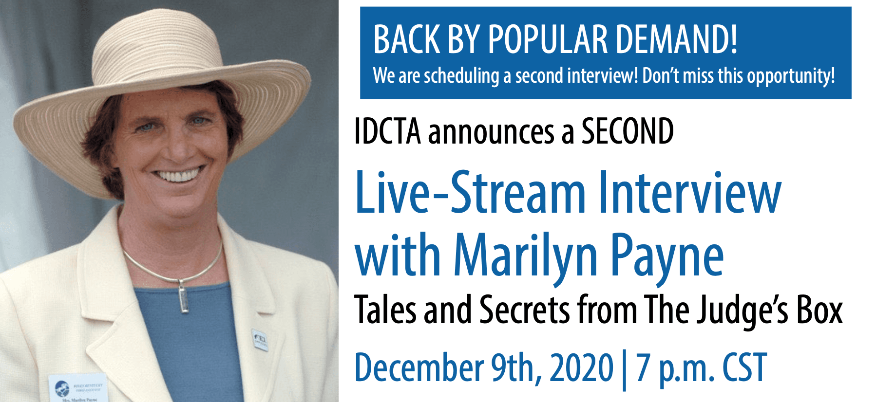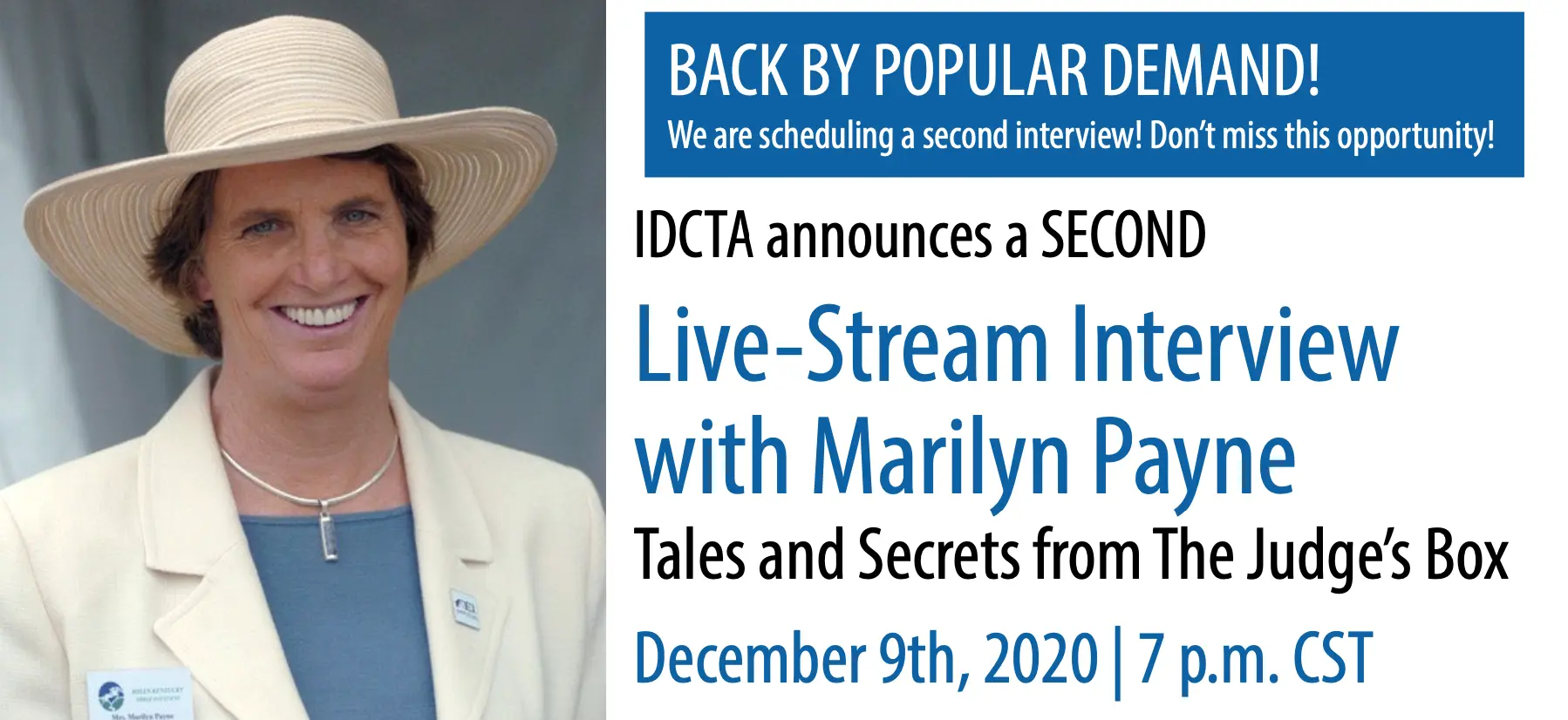 From perfecting test movements to corrections that can save a movement score, to the dos and don’ts and ins and outs of showing, come join us for a live stream interview with Marilyn Payne. She and IDCTA Eventing VP Eric Dierks have some entertaining stories to illustrate their points. Whether you are an eventer or a dressage enthusiast, this event should be quite entertaining and educational. Click here to request directions for joining the session.
