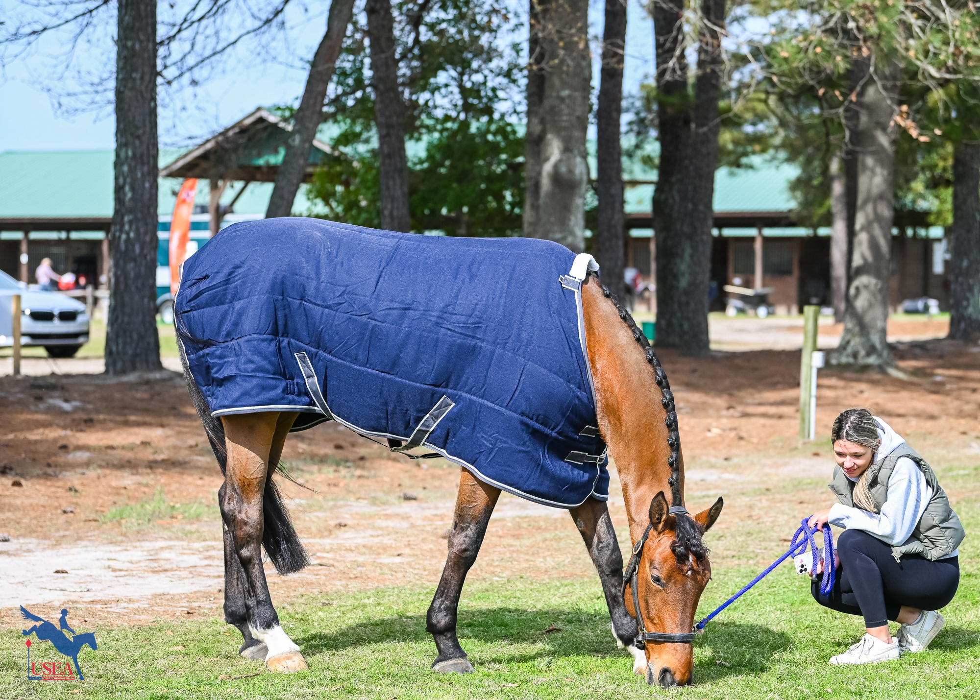 When competing on raw, rainy days, Jarboe keeps plenty of layers on hand for after cross-country. “You want to get them cleaned off quickly, and then usually you just have to be quick to kind of bundle them up with a knit on the bottom, so that they have some airflow. And then just layering is really important. You usually want either a fleece or a wool on top, so that the moisture is just getting wicked off. And then you need to top that with a sheet, if you have to walk around or something. Once they're dry, it's important to get those rugs switched out so that they're not staying in the wet rugs.”