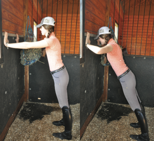 to the muscles that you regularly use shoveling shavings and pushing wheelbarrows. While most riders have extremely strong upper backs, our chest muscles tend to lack. So ideally one should be doing exercise to work your pectoralis to stabilize and strengthen the upper body. The same applies to our lower body – it is important to strengthen the hip abductors to balance the already strong hip adductors.
