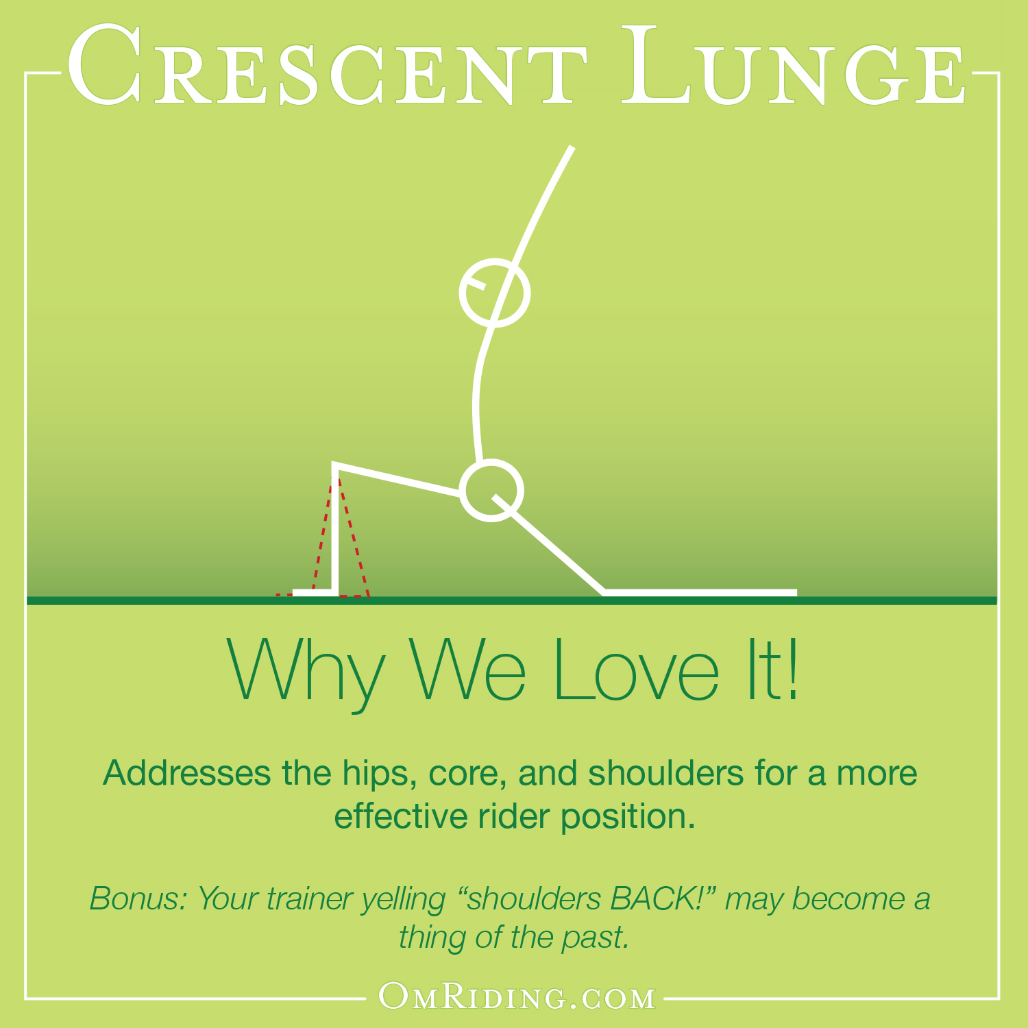 - Backbend/heart opener - helps front of body expand, increase energy, use of breath, improved posture/seat in the saddle, reduces fatigue.