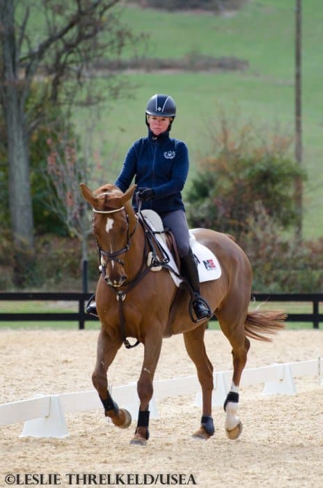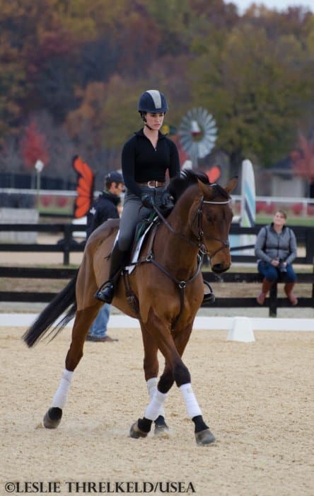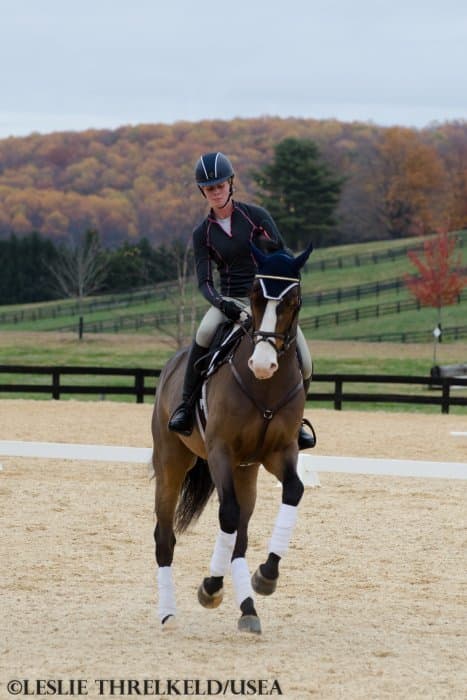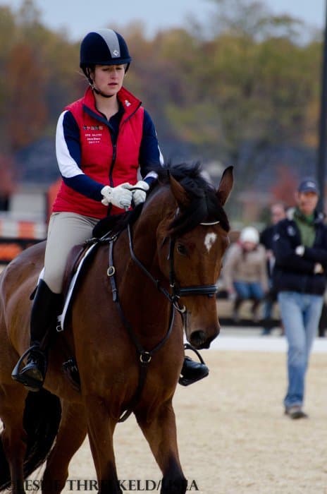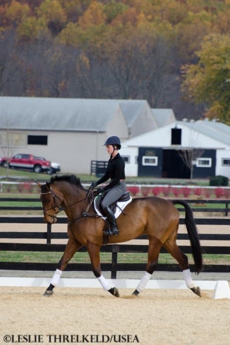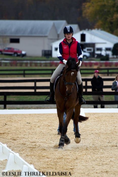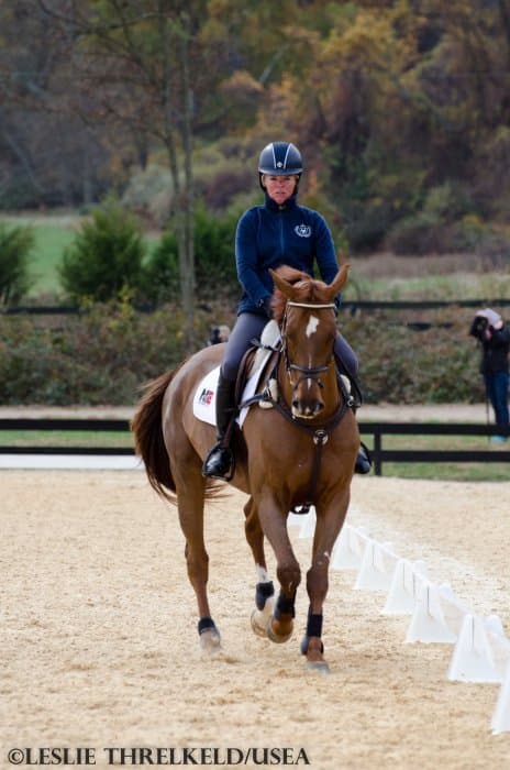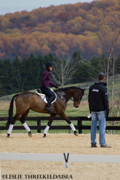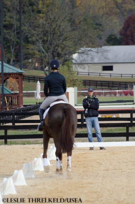 He had several of the pairs put both of their reins in their outside hand and continue to travel about the arena when the contact “got a bit fragile,” or the horse was having a hard time with self-carriage. This also ensured that the riders were not controlling their horses too much with the inside rein. Finally, with each pair, he said that he liked to see a stretchy trot at the end (and if possible, also the beginning) of each ride, allowing the horse to stretch forward and down with the rider in rising trot.