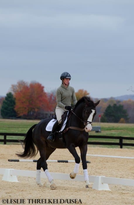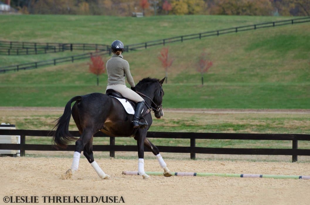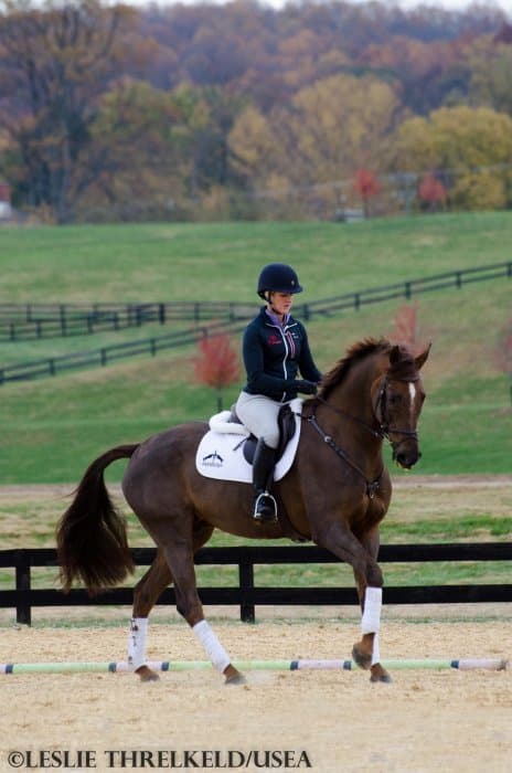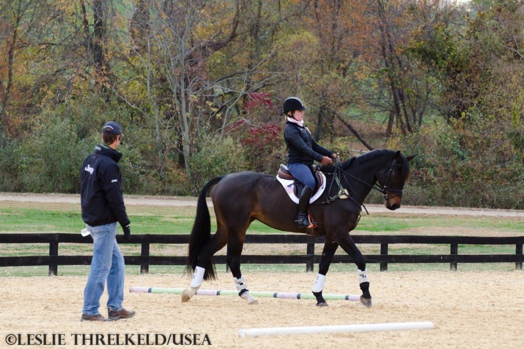 Alexa Ehlers and Kate Brown were last to go before the lunch break. They worked over a 20-meter circle of 4 cavaletti. He encouraged them to find the step to the poles not by shortening the canter, but by adjusting their line to the poles, and allowing the canter to flow as if the poles were not there. When one of the horses got low in its frame, he asked why. “I don’t mind him being there (in that frame) if that’s the plan. Otherwise, don’t just go along with it.”