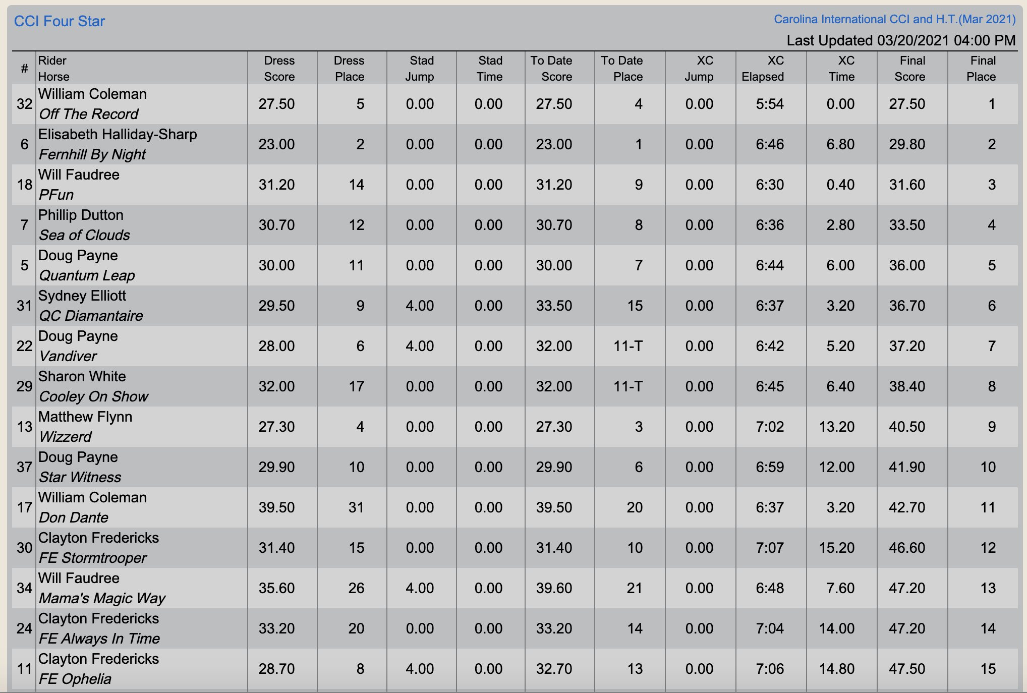 Cross-country proved influential across all divisions once again at the Cloud 11~Gavilan North LLC Carolina International CCI and Horse Trial, presented by Lumbee River EMC. All three winners added nothing to their overnight scores to take home the FEI wins with Will Coleman and his own Off The Record bringing home the Setters’ Run Farm CCI4*-S title, Phillip Dutton and Caroline Moran’s Quasi Cool picking up the blue in the Attwood Equestrian Services CCI3*-S, and Andrew McConnon securing the Breezeway Sporthorse and Diagnostic Clinic and Friendship Mobile Veterinary Imaging and Sports Medicine CCI2*-S win with Jeanne Shigo’s D’Luxe Steel.