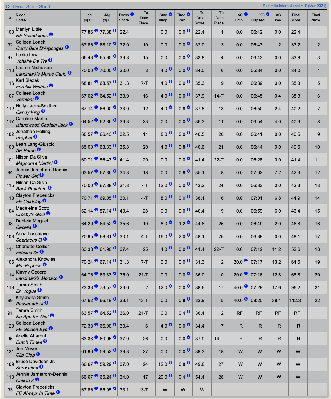 Marilyn Little and RF Scandalous began their weekend in the CCI4*-S at the 2021 Red Hills International Horse Trials with a strong performance in dressage and added two clean jumping phases to finish on their dressage score of 22.4 and take home the blue ribbon.