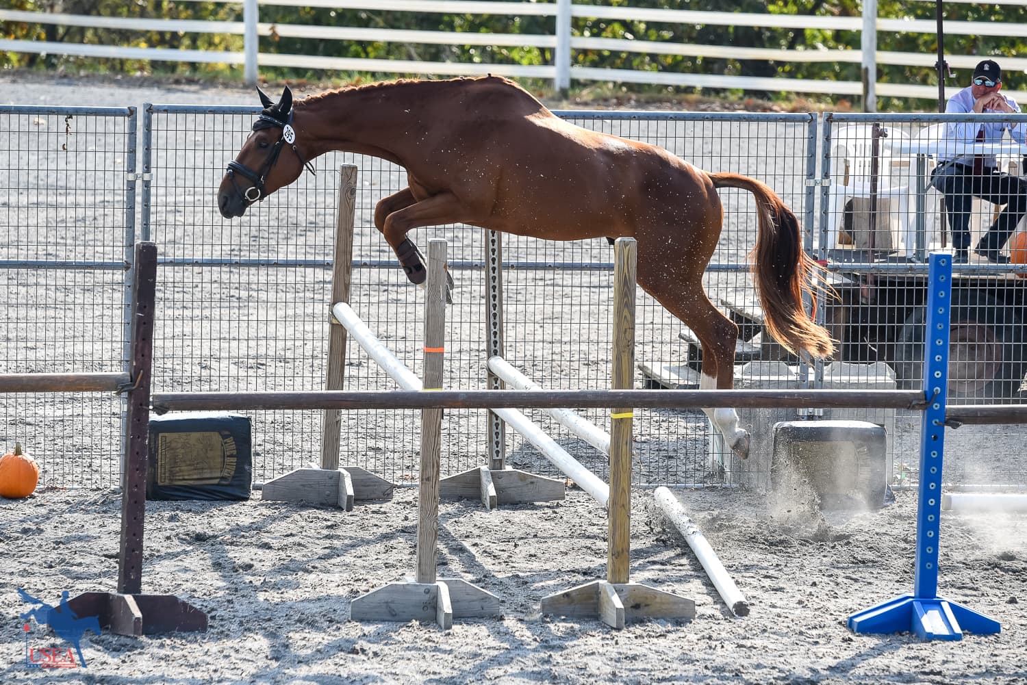 “He came out huge,” she described. “I had to pull him out myself, so we had a bond right away. He was six week’s overdue – he was 3’7” when he stood up, so I called him my Preliminary jump. He had legs everywhere and this tiny little body and I just spent as much time as I could with him and started doing things right away so we went for walks and I ponied him off his mother and he’s done cross-country in-hand.”