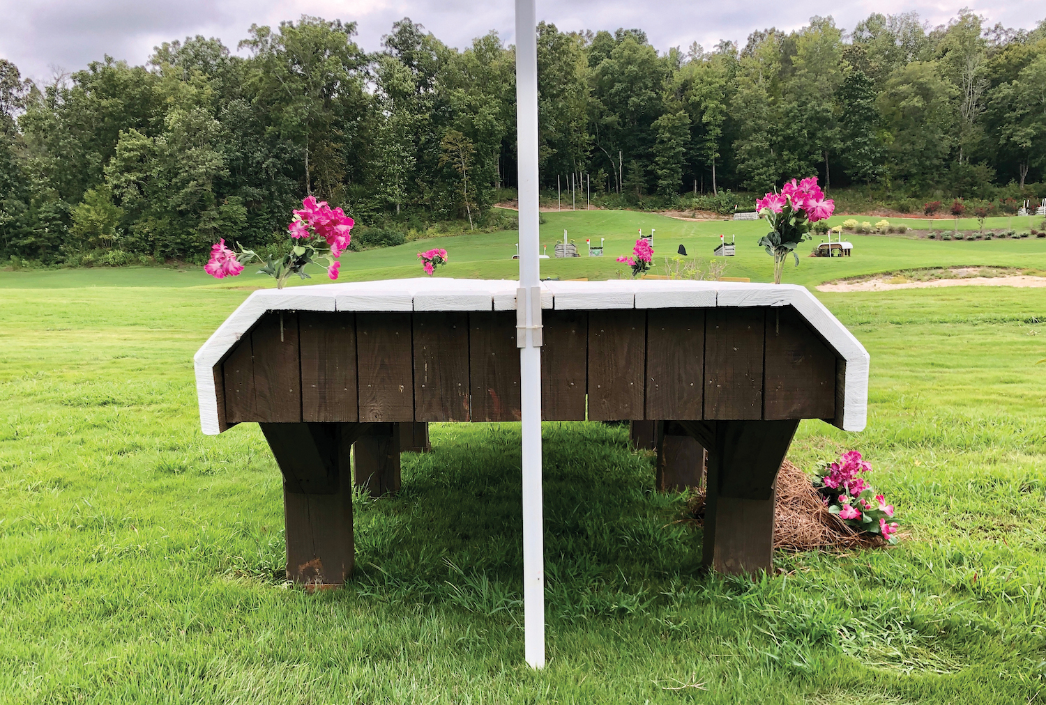 Portable cross-country jumps can be anything from tables to roll tops to steeplechase fences or more technical things like corners and chevrons. Jumps that are not firmly secured by posts dug into the ground or by other means of “grounding” (such as stone walls or naturally occurring obstacles), should be staked and secured. This prevents the jump from moving in any way that could potentially cause harm to a horse from stopping into the obstacle, banking off of it, landing on top of it, or simply forgetting a leg upon take-off or landing.