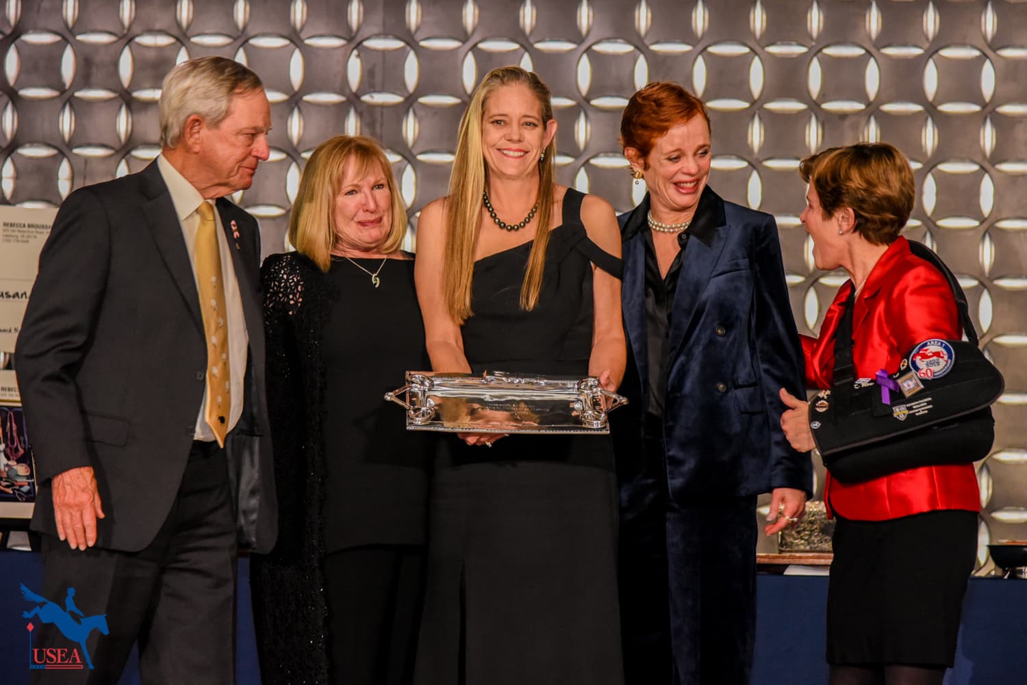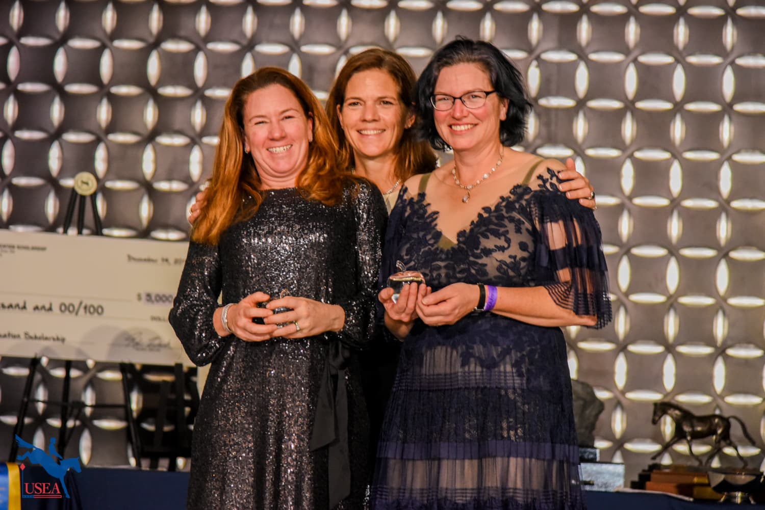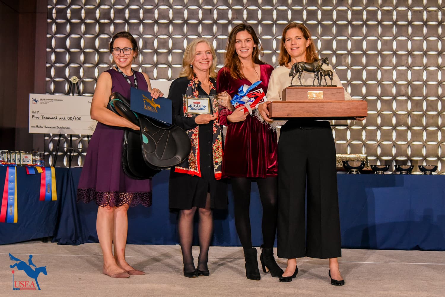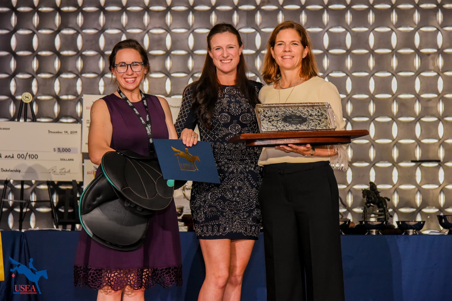 The evening’s presentation began with the USEA Classic Series drawing sponsored by DG Stackhouse and Ellis Saddles. USEA President Max Corcoran and Lesley Ellis presented the prize to the winner of the drawing, Dr. Jennifer Miller (Cave Creek, Arizona). Miller was awarded a custom fitted Stackhouse and Ellis saddle.