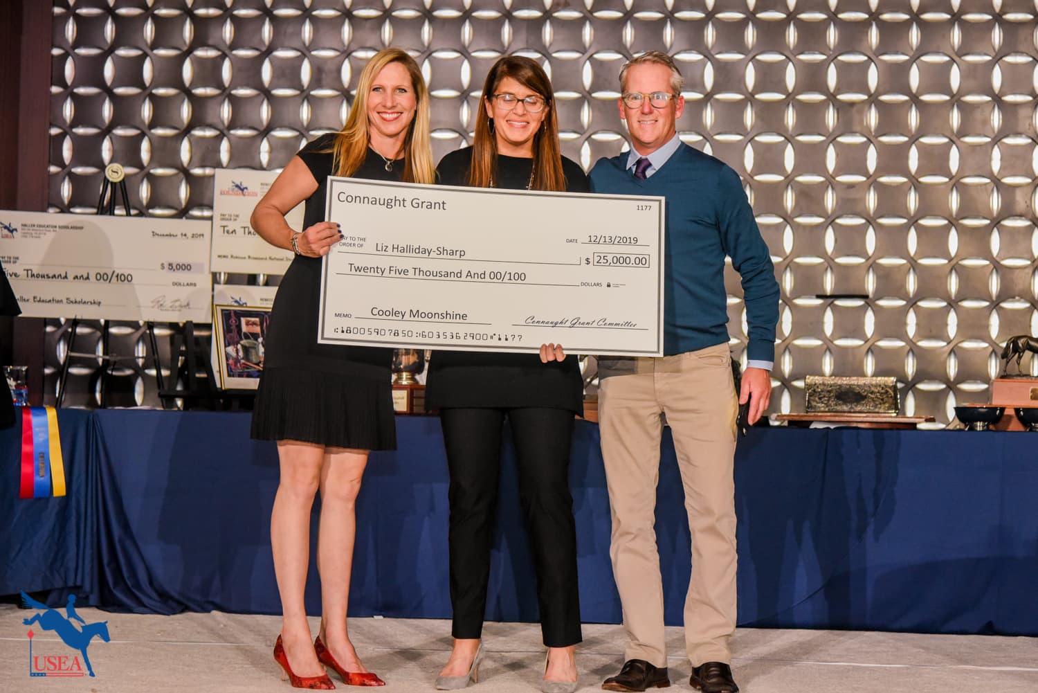 The Connaught Grant, now in its fourth year, is designed for a horse competing at the CCI2* or CCI3* level who shows potential to one day be on the U.S. Team and is presented in memory of Bruce Duchossois. Joanie Morris and Bobby Costello presented a check for $25,000 to Cooley Moonshine (Cobra x Kilpatrick Dutchess), a 7-year-old Irish Sport Horse owned by The Monster Partnership and ridden by Elisabeth Halliday-Sharp.