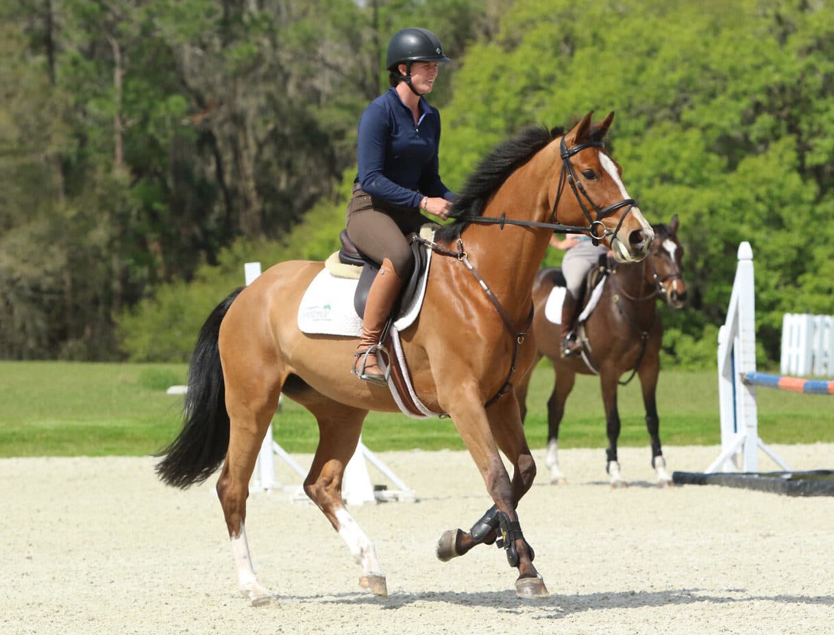 For jumping, I want a horse that jumps and stays within the same rhythm, has a consistent and reliable shape and is safe and aware of their own legs and the fence. I don’t want to create a horse that I must always dictate when and where to leave the ground and how hard to jump. My responsibility as a rider is to put the horse into a balance and canter that gives them the ability to do their job, and then if I taught them correctly, I should be able to leave them alone to do it. The one thing we need to keep in mind when developing young horses is that the language they understand is the application and release of pressure, that is the most effective way to teach them a new concept in a way they understand.