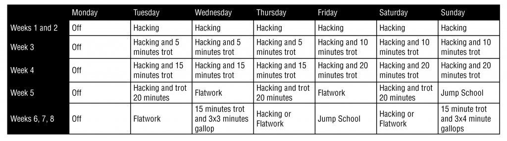 When I am deciding when to bring my horses back to work I like to work backwards from their first competition. I want to start them back a minimum of six weeks out from their first event, but I prefer eight weeks.